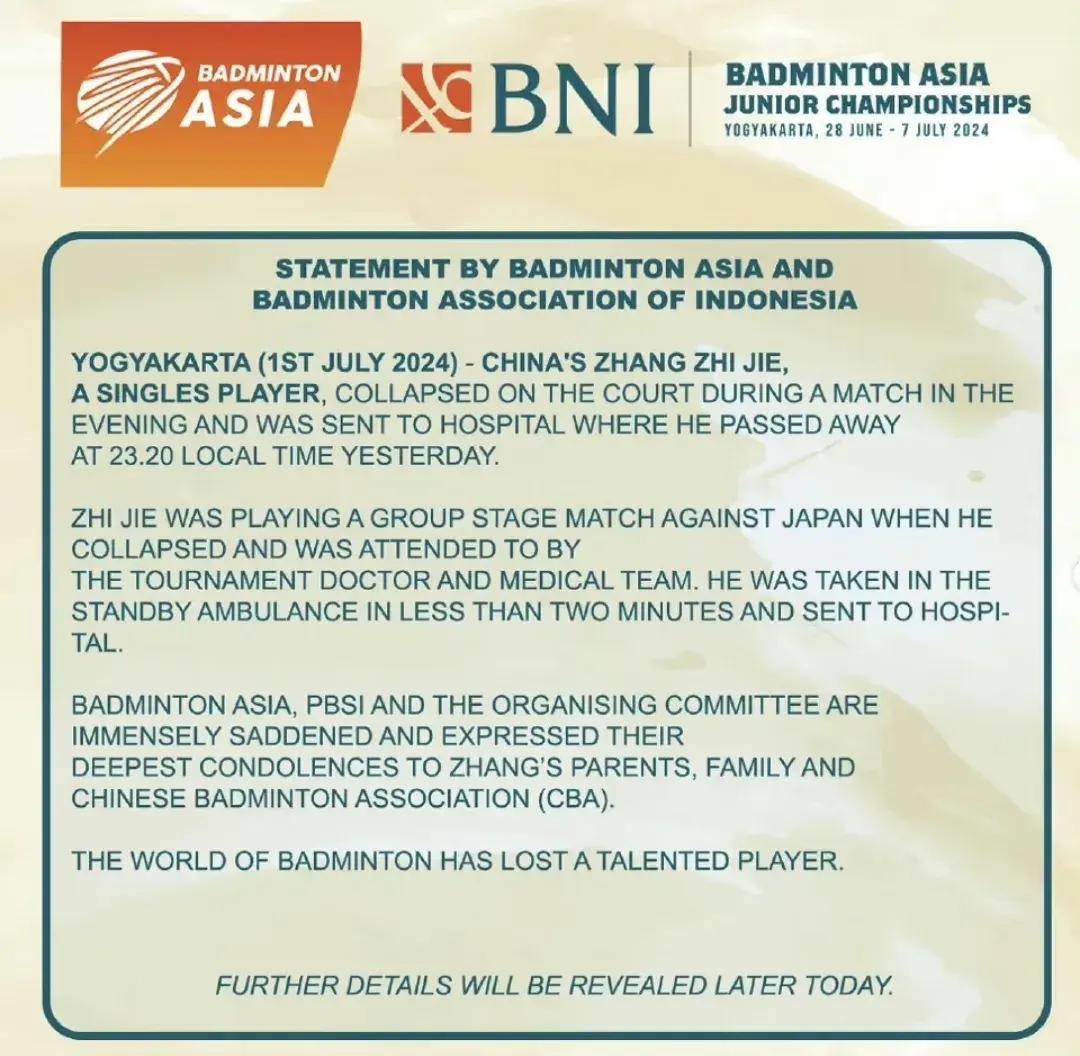 賽後,亞洲羽協和印尼羽協都發了聲明,對此深表悲痛,並向張志傑的父母、家人和中國羽毛球協會表示慰問,但說再多也不能換回一個羽球天才的生命,根據流出的比賽現場視頻,可以看出在張志傑倒地後,現場緊急醫療反應的速度實在太慢了,中國隊教練第一時間靠近弟子,也手足無措,他只能大聲呼喊,但轉播畫面中只有他和日本對手站在場內,長時間沒有其他人再入畫了。