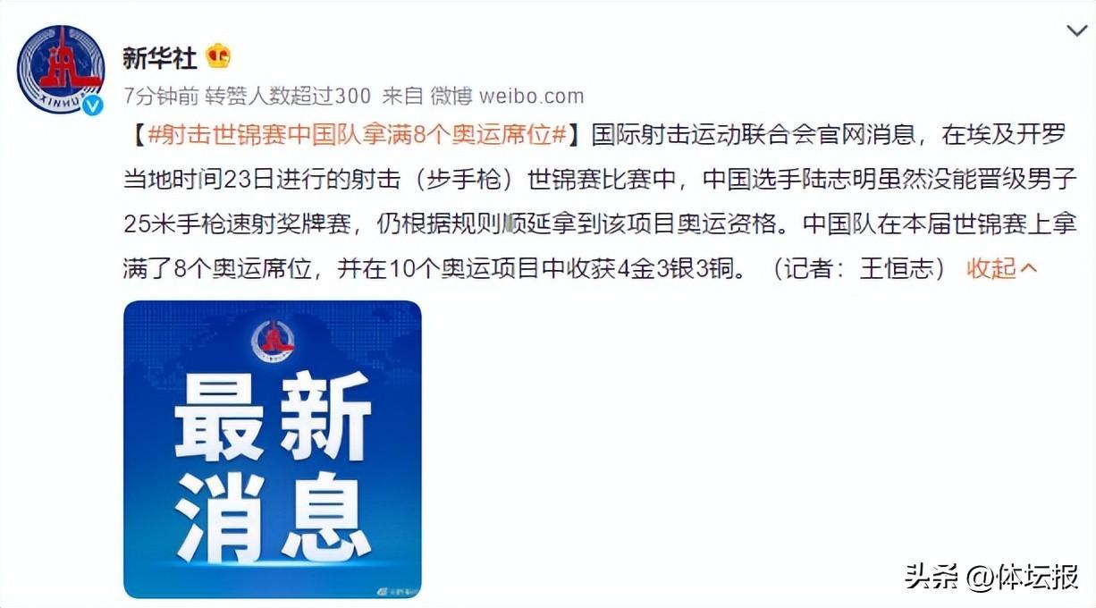 本屆射擊世錦賽,浙江隊共派出6名隊員參賽,其中黃雨婷、王芝琳、盧愷曼和趙中豪參加成年組比賽,馮思璇和劉軍輝參加青年組比賽,6人共交出了7金3銀3銅的成績,併爲中國代表團收穫了兩個巴黎奧運會的席位。在此次射擊世錦賽上,中國隊已經收穫25金16銀14銅(截至10月23日24時),共收穫8個巴黎奧運會席位。