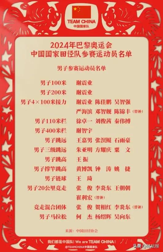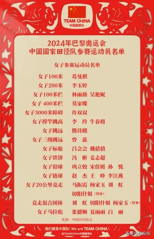 4日晚,中國田徑協會公示巴黎奧運會中國隊參賽名單。