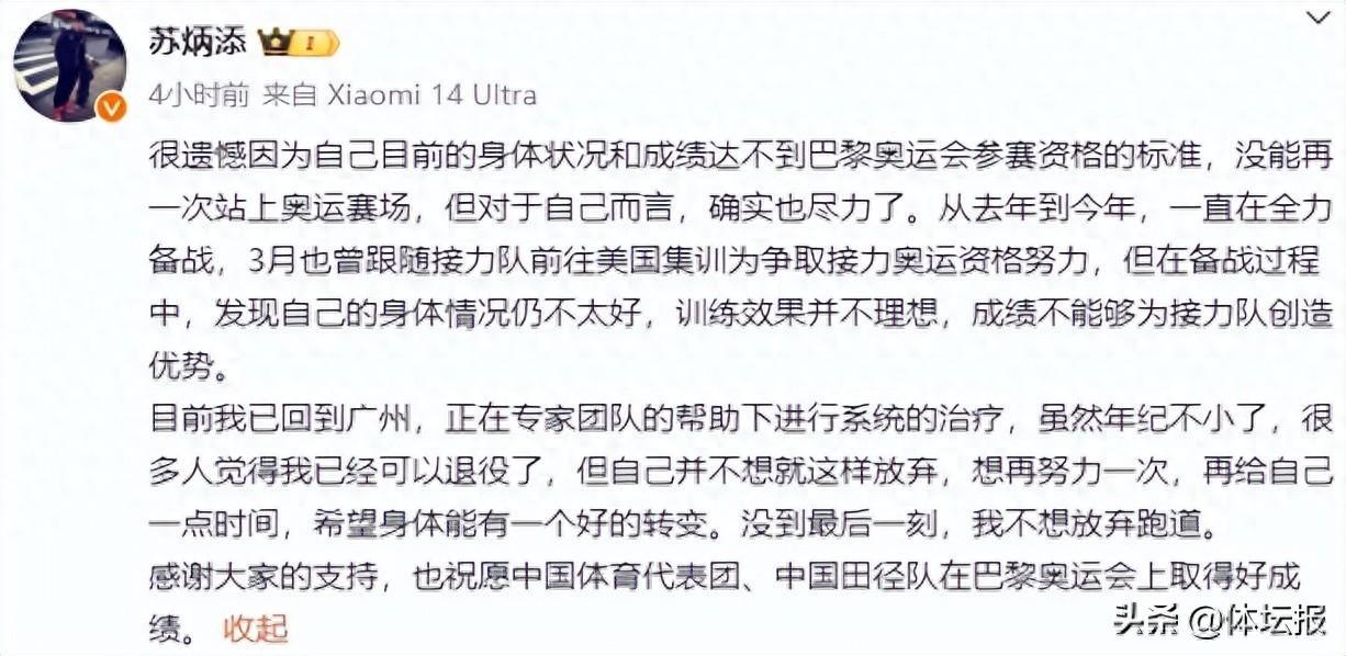 7月5日,老將蘇炳添發文回應沒能參加巴黎奧運會一事,他表示: