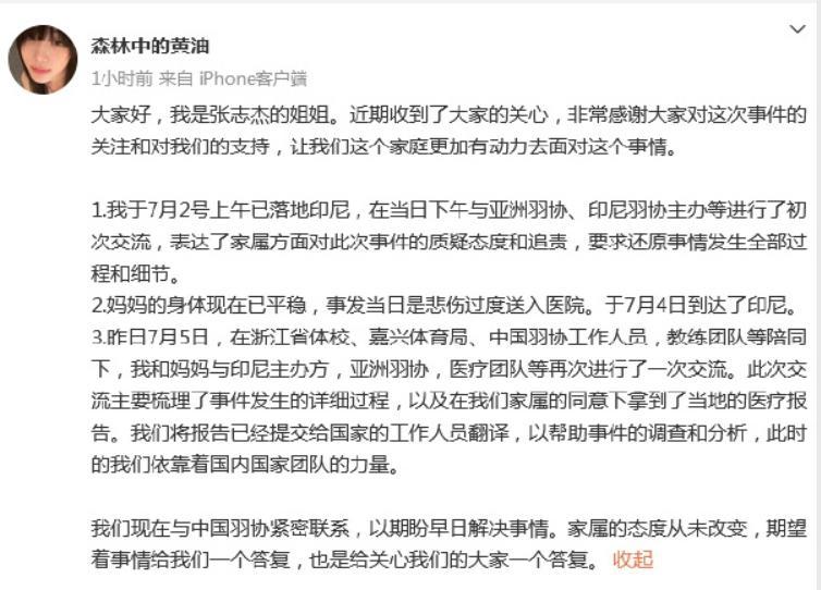 可是這麼重要的時間節點,他依然還在事發地印尼,沒能回到自己的祖國,根據最新消息,張志傑的親姐姐和母親已經先後抵達印尼了,陪同的還有中國羽協、浙江體校以及嘉興體育局的相關工作人員。