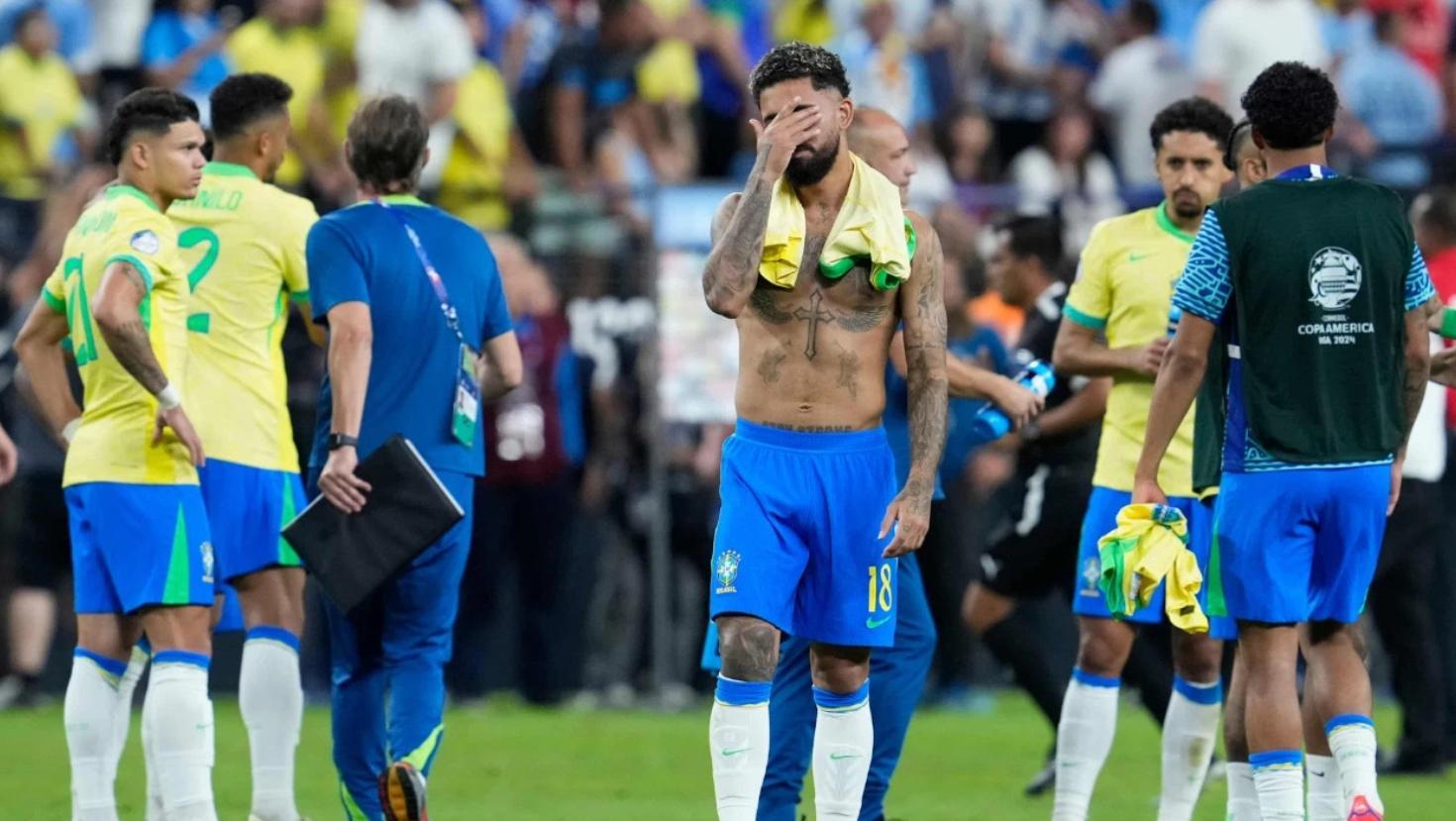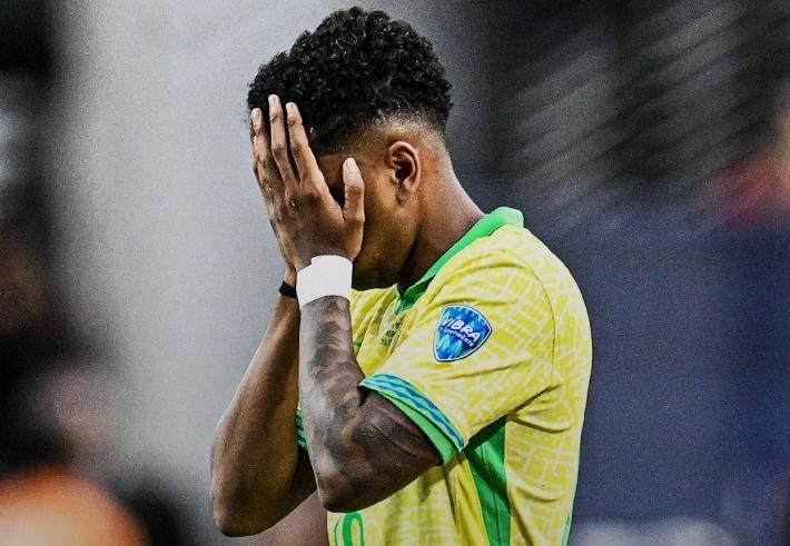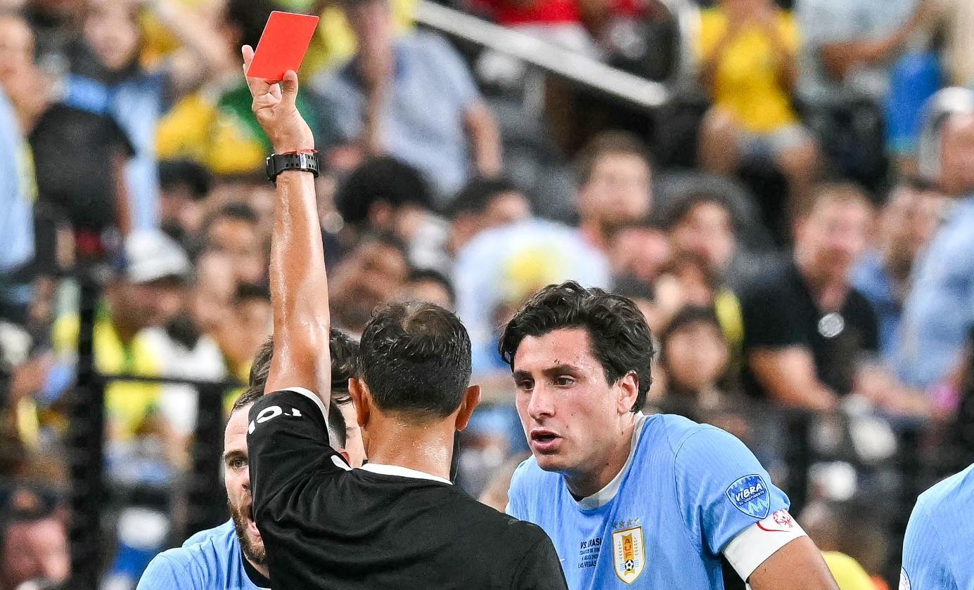 美洲盃四分之一決賽,烏拉圭對陣巴西,上半場努涅斯頭球造險,阿勞霍傷退離場,拉菲尼亞也失良機,易邊再戰,南德斯兇狠放鏟羅德里戈,裁判看過VAR後出示紅牌,烏拉圭十人應戰,常規時間內雙方平局,均無建樹,直接拖入了點球大戰!