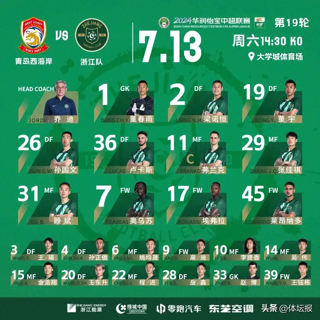 浙江隊本場比賽陣容(圖源:浙江FC)