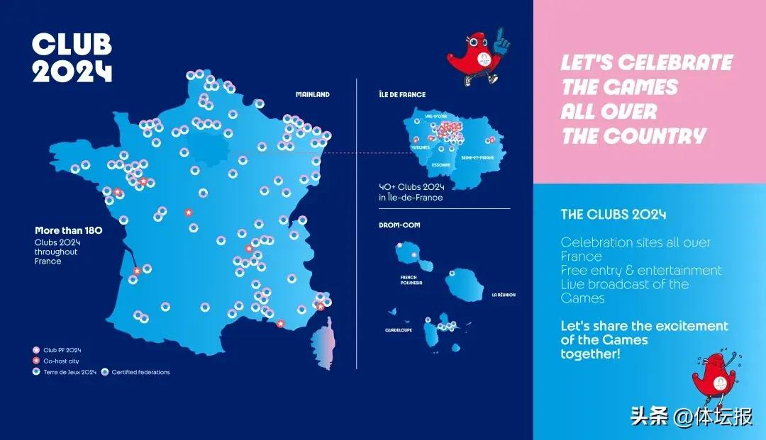 不僅在巴黎市區裏,在舉辦足球賽事的每一個法國城市(波爾多、里昂、南特、尼斯、巴黎、聖埃蒂安、馬賽)至少都會設立一個巴黎2024俱樂部,此外里爾以及承辦衝浪賽事的塔希提島也將如此。據官方消息,法國各地將有超過180個巴黎2024俱樂部。