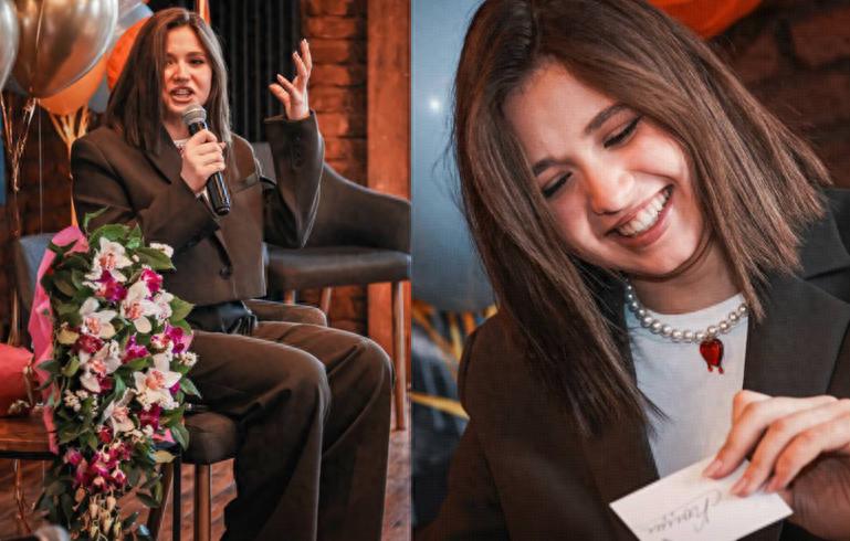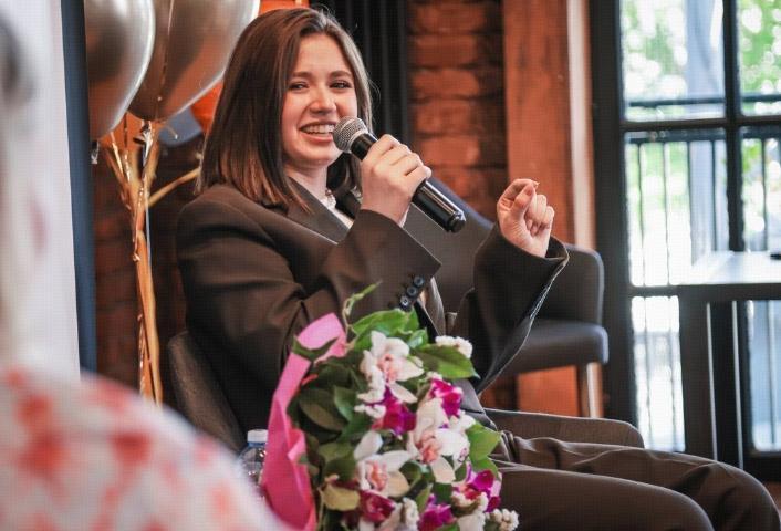 這次亮相,18歲的瓦利耶娃裝扮頗爲成熟,一席深褐色的西服套裝,完全不像運動員時期的狀態,一頭柔順直髮垂肩,舉止端莊優雅,手握話筒侃侃而談,很有一種女企業家的風範。