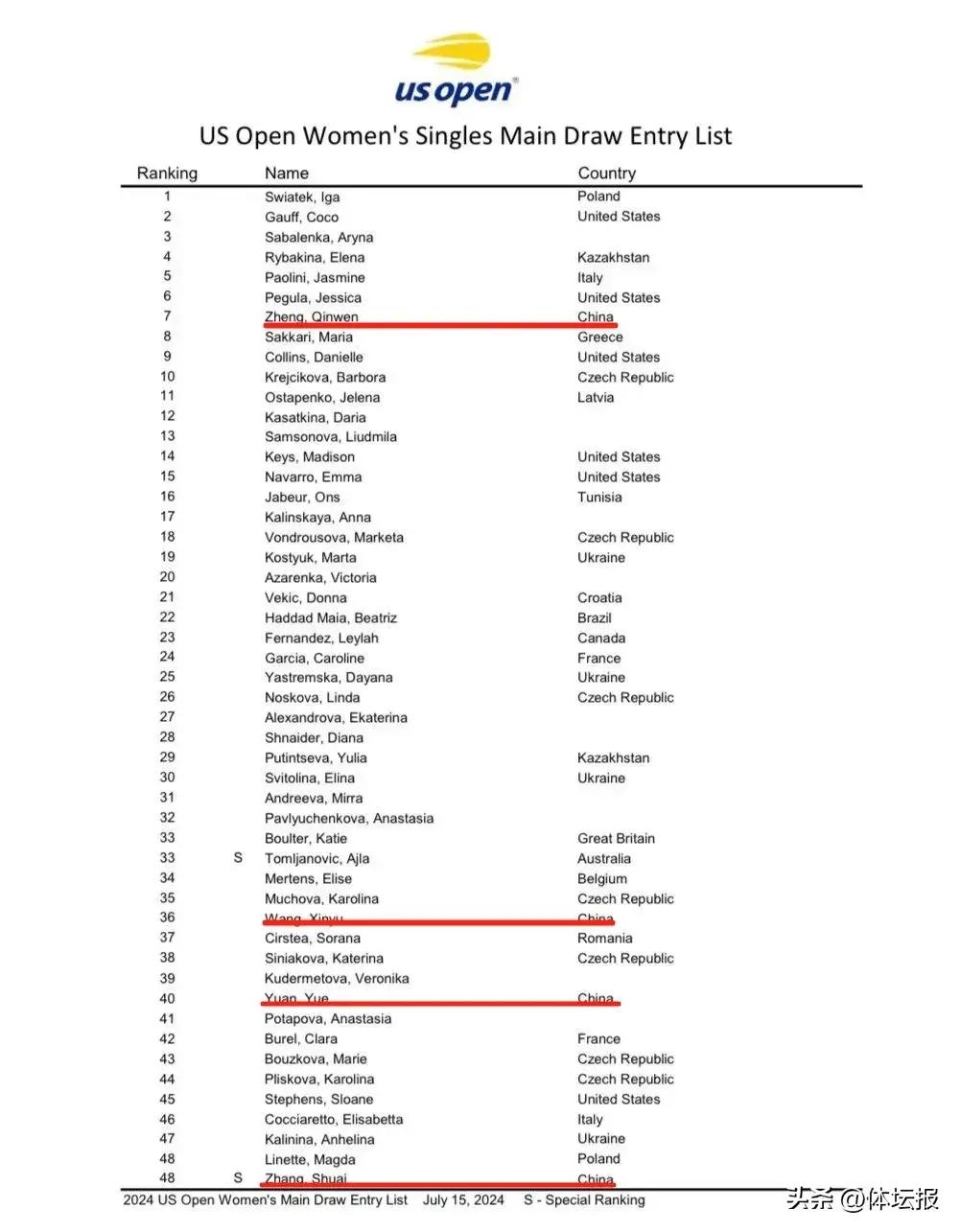 2024美網將於8月26日至9月8日在比利·簡·金國家網球中心舉行,男女單打正賽名單近日揭曉,中國軍團多達11人直接入圍。
