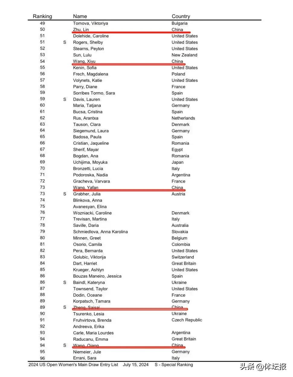 中國軍團包括鄭欽文、王欣瑜、袁悅、朱琳、王曦雨、王雅繁、張帥、鄭賽賽、王薔、張之臻、商竣程,其中張帥、鄭賽賽和王薔持保護排名參賽,商竣程在今年溫網後再次憑藉排名直接入圍。布雲朝克特、白卓璇、韋思佳、高馨妤、尤曉迪目前已鎖定資格賽席位,屆時將向正賽資格發起衝擊。