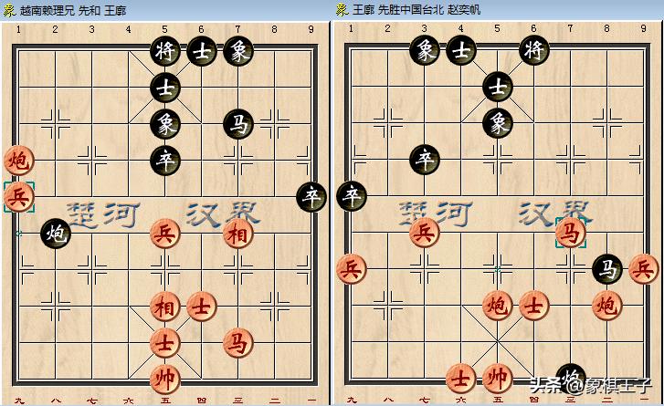 王廓前三戰連捷,第四場會壘中國越南隊強將,越冠軍賴理兄,兩人之局,賴理兄執先,仙人指路對挺卒陣,佈陣急衝。