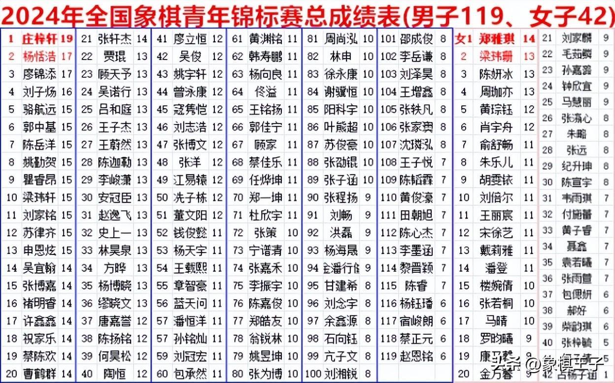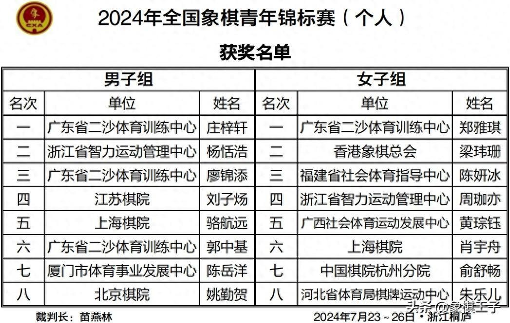正所謂翩翩年少,錦瑟年華,是日的2024年全國象棋青年錦標賽,四位新的男女國家大師應運而生,男子廣東莊梓軒、浙江楊恬浩,女子廣東鄭雅琪、香港梁瑋珊榮耀晉升。