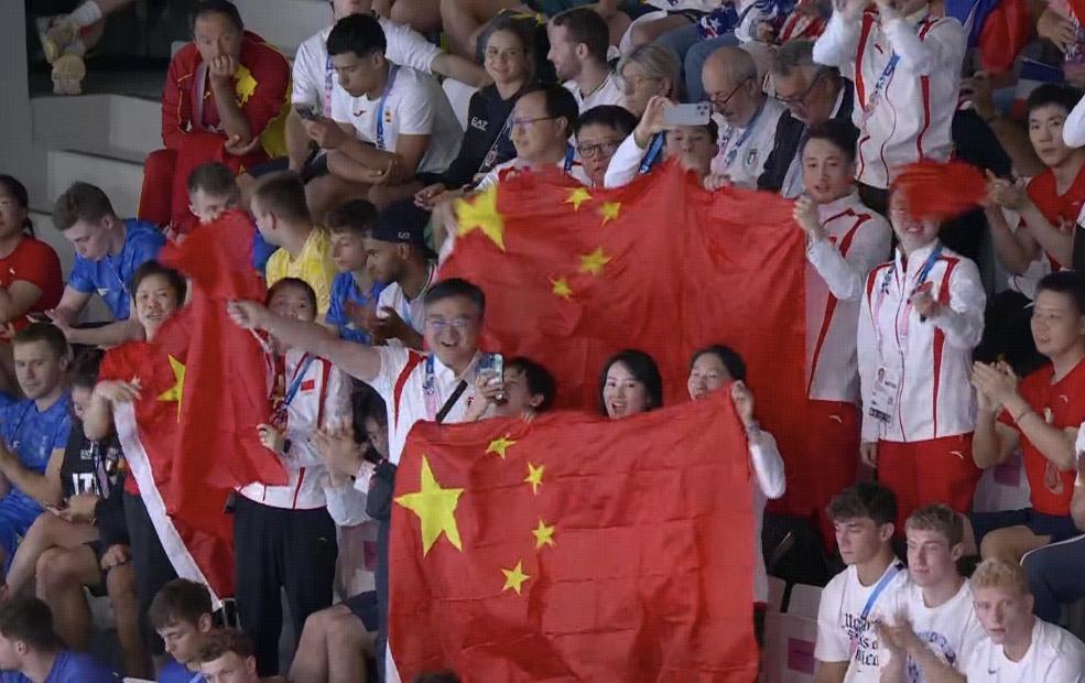 中國選手賽後鞠躬致謝,看臺上滿是五星紅旗飄揚,畢竟是我們的優勢項目,現場助威的中國觀衆非常多,幾乎把這裏變成了自己的主場。