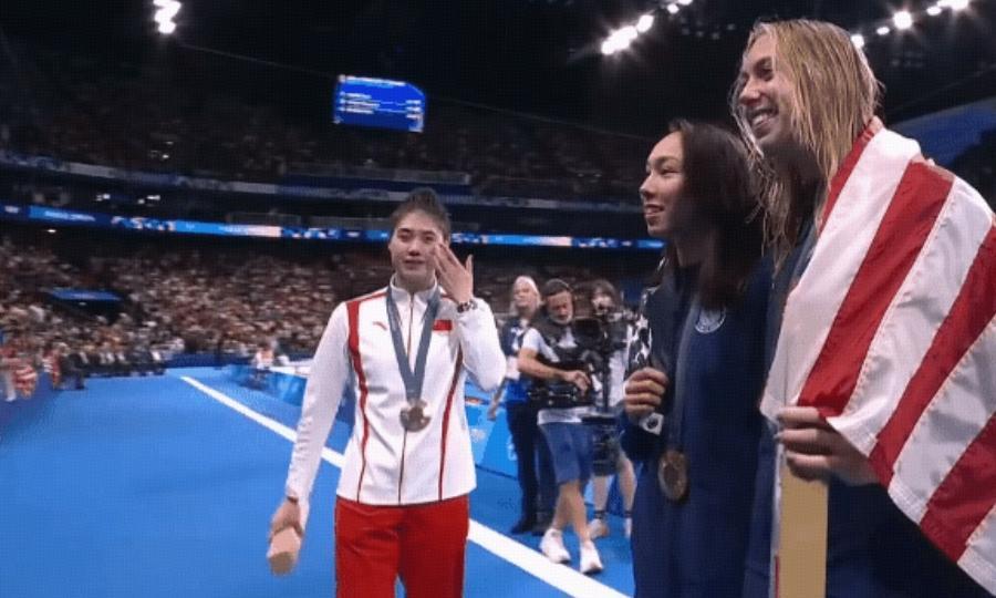 值得一提的是,在頒獎儀式結束之後,張雨霏還一度悄悄落淚,跟兩位美國選手站在一起的時候,顯得有點落寞和孤單。