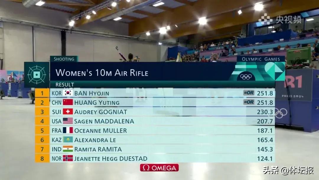北京時間7月29日,巴黎奧運會女子10米氣步槍決賽,韓國16歲選手潘孝珍與中國選手黃雨婷雙雙以251.8環平了奧運會紀錄。加槍環節,黃雨婷10.3,韓國選手10.4,遺憾以0.1環的劣勢獲得該項目銀牌。此前,北京時間7月27日下午,黃雨婷和搭檔盛李豪奪得10米氣步槍混合團體冠軍,將本屆巴黎奧運會首金收入囊中。作者:酈琪琛(體壇報)