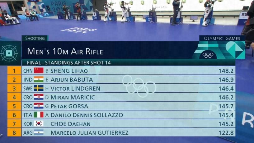 在決賽首輪5發射擊結束之後,他的表現非常出色,暫列第一,甚至連續打出了10.8環的好成績,而在第二組5發之後,盛李豪的表現依然很強勢,最低都是10.2環的成績,這樣一來,10發戰罷,105.8環,排名所有決賽選手的第一位,領先第二名0.8環,接下來進入殘酷的末尾淘汰制,盛李豪需要繼續穩住心態,一槍一槍地打,不要受到干擾。