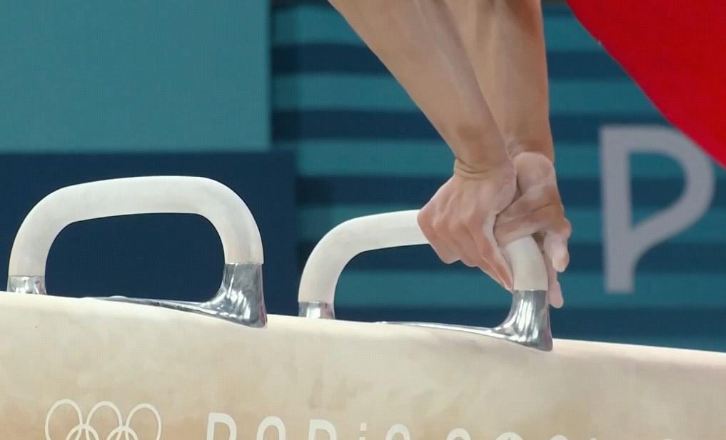 慢鏡頭回放顯示,橋本大輝的兩隻手撐到了一起,一下子錯不開了,所以導致了這次跌落器械的失誤,可以說是非常離譜了,這完全是比賽時不夠專注造成的。