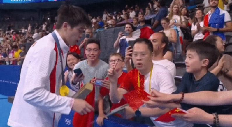 對於潘展樂來說,這塊金牌確實是來之不易,非常重要,不僅是他,巴黎現場的中國助威團也是興奮至極,賽後有觀衆拿國旗給潘展樂簽名,而他並沒有被冠軍衝昏天,突然迴歸理智,表示國旗上不能簽字,然後主動改爲與粉絲合影自拍,非常暖心。