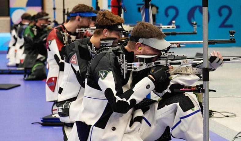 隨後跪姿的最後一組射擊,劉宇坤發揮依然穩定,總成績來到153.9環,繼續排名第二,狀態越來越好了。結束完跪姿動作,接下來換成臥姿,依然也是三組角逐,累計15發。第一組打完,劉宇坤依然是第二,落後頭名海格0.9環的差距,還有追趕機會。