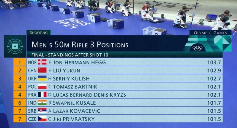 回到這場決賽,第一組5發射擊之後,劉宇坤拿到51.3環,暫列第四位,排名榜首的運動員來自挪威,緊隨其後的是東道主法國,以及波蘭的選手。到了第二組的5發射擊,劉宇坤的發揮回暖,打出51.6環的成績,10槍之後總環數102.9,排名從第四上升到了第二位,領先的依然是挪威選手海格,兩人目前環數相差0.8環。