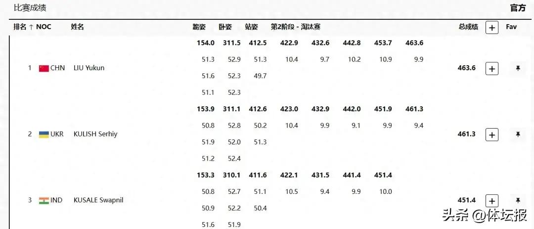 在北京時間8月1日15點30分的男子步槍三姿決賽中,劉宇坤在第一個跪姿結束後排名第二,落後第一名1.3環;第二個臥姿,劉宇坤錶現平穩,縮小差距,以0.6環的劣勢繼續排名第二;最後一個站姿,頂住壓力,最終以總成績第一拿下冠軍。