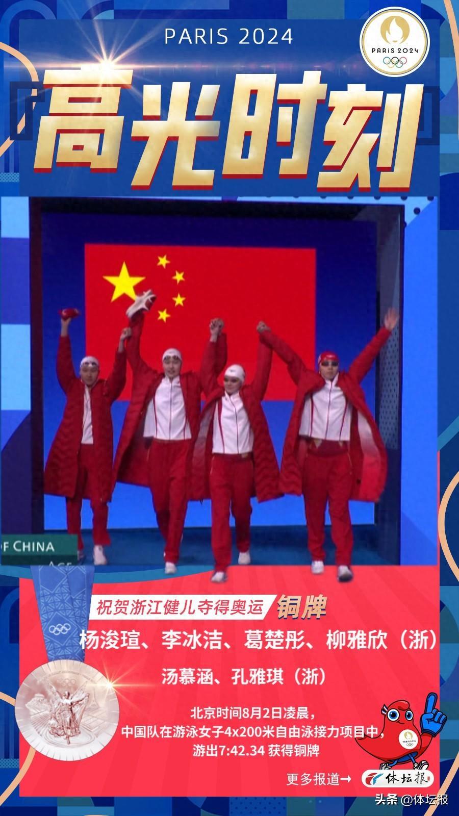 北京時間8月2日凌晨,正在舉行的巴黎奧運會游泳比賽,壓軸上演接力賽巔峯對決。在女子4×200米自由泳項目決賽中,中國隊以7分42秒34的成績奪得一枚寶貴的銅牌,決賽選手楊浚瑄/李冰潔/葛楚彤/柳雅欣,攜在預賽中亮相的湯慕涵、孔雅琪登上領獎臺。冠軍被勁旅澳大利亞隊以7分38秒08的絕對優勢獲得,並打破了中國隊在東京奧運會上創造的奧運會紀錄;美國隊以7分40秒86的成績奪得銀牌。