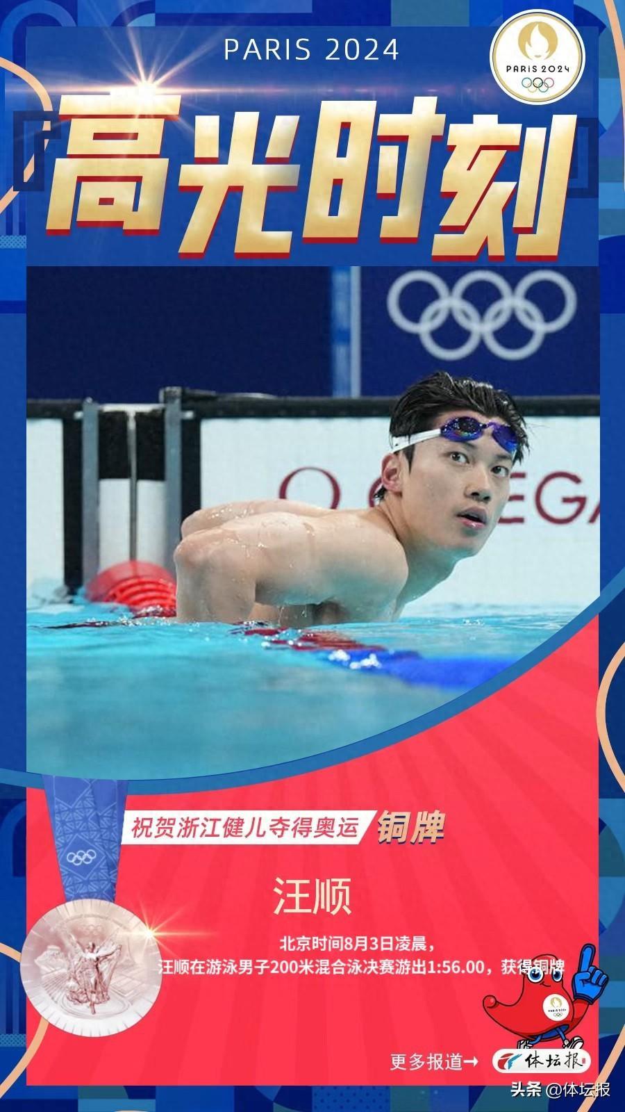 北京時間8月3日凌晨,正在巴黎拉德芳斯體育館進行的游泳比賽,男子200米個人混合泳決賽展開白熱化競爭,中國選手汪順游出1分56秒00的成績,奪得一枚寶貴的銅牌。東道主法國小將馬爾尚奪得金牌,銀牌由英國選手斯科特獲得。