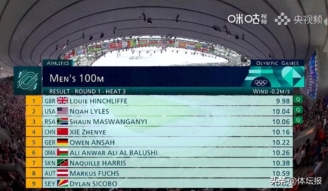 北京時間8月3日晚,2024巴黎奧運會田徑男子100米第一輪預賽打響,浙江選手謝震業跑出10.16的成績,位列小組第四。