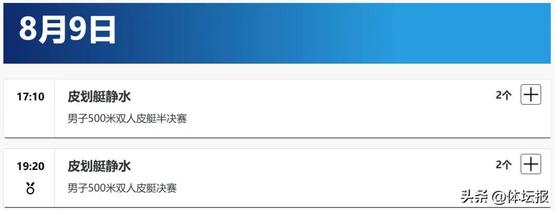 男子500米雙人皮艇半決賽和決賽將於8月9日舉行。