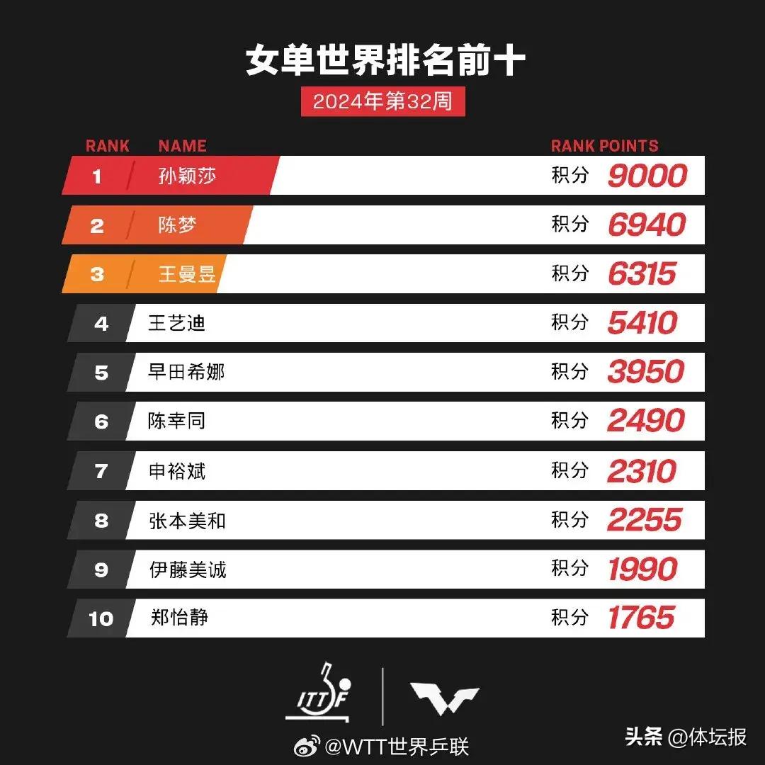 女單方面,孫穎莎以9000分位列第1,陳夢、王曼昱、王藝迪位列第2至4名。