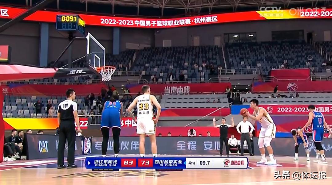 在缺乏外線爆發點的情況下,四川隊只能將球頻繁地交給塔比特,但並不以得分見長的他無法撐起球隊的進攻。孫銘徽、趙巖昊相繼命中三分後,東陽光將領先優勢首次擴大至兩位數。半場戰罷,進攻效率提升的東陽光將比分改寫爲43:32。