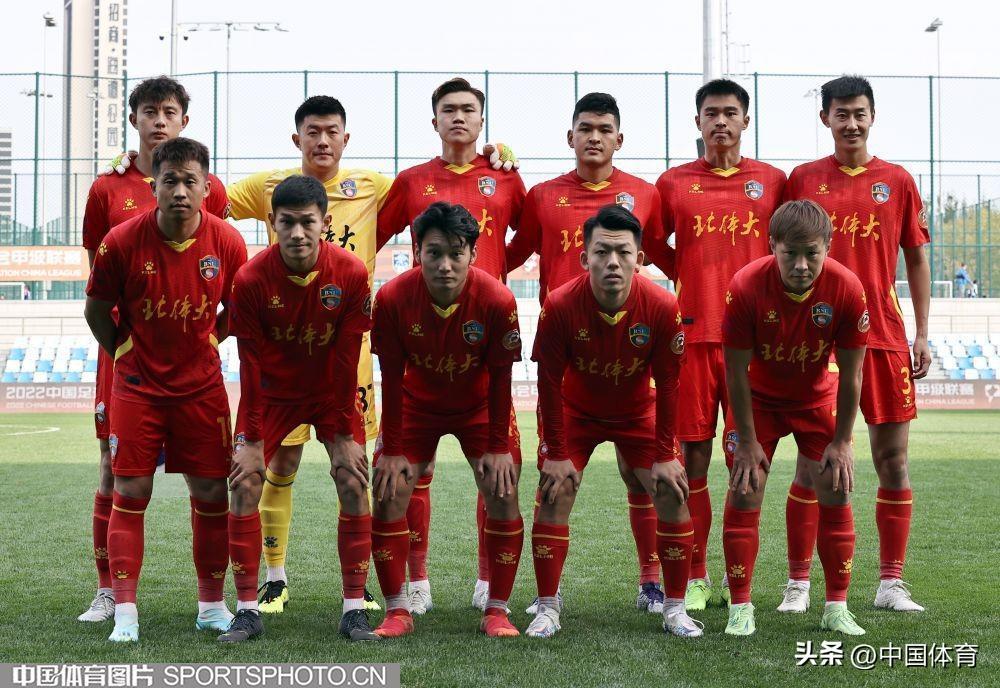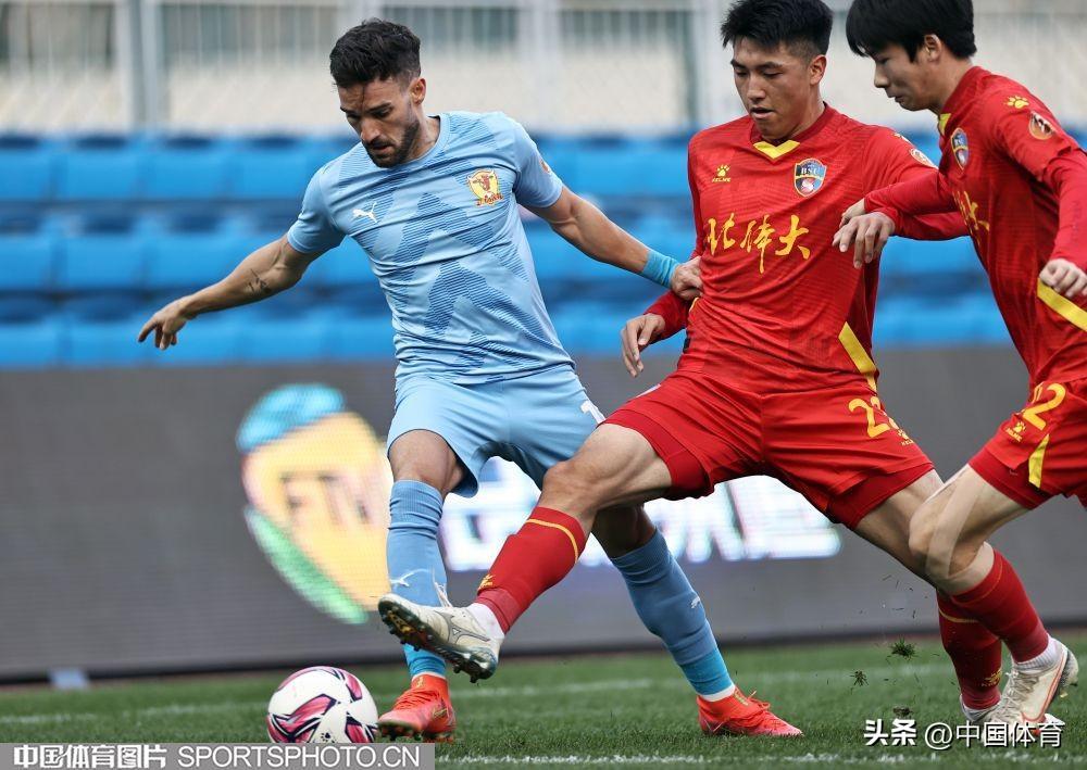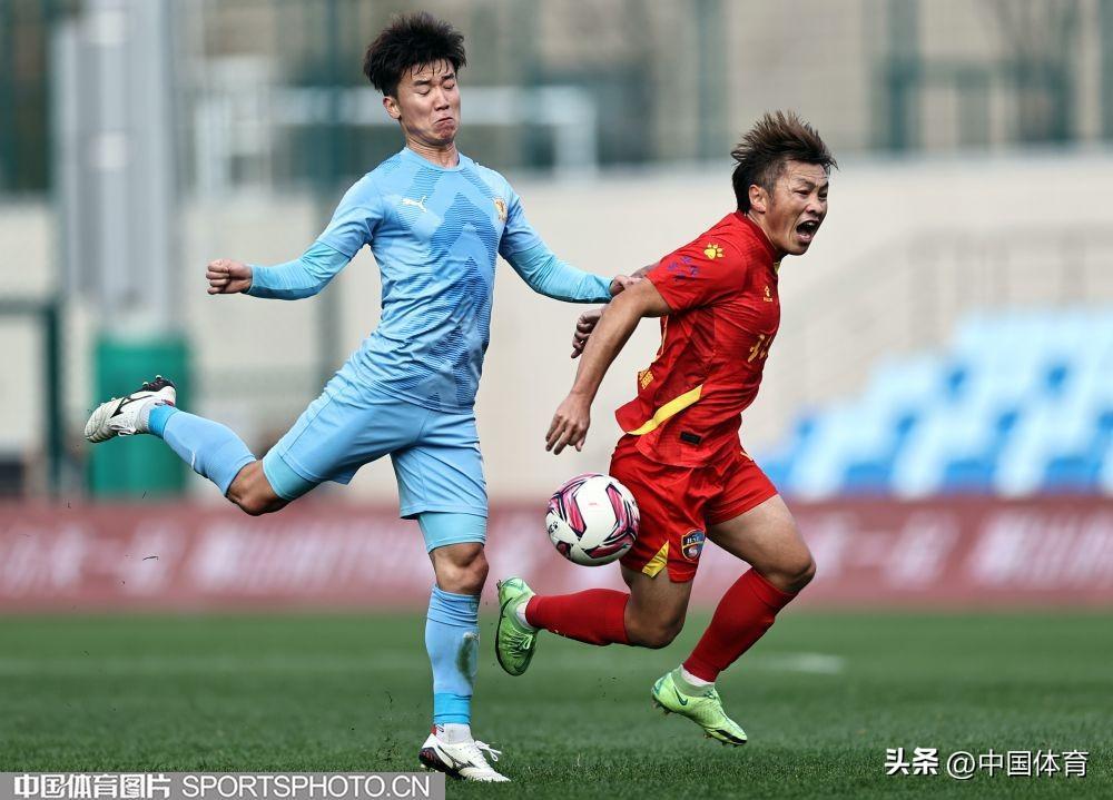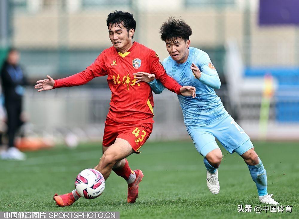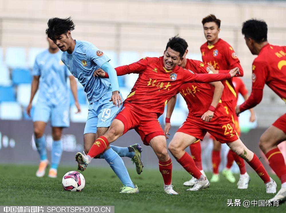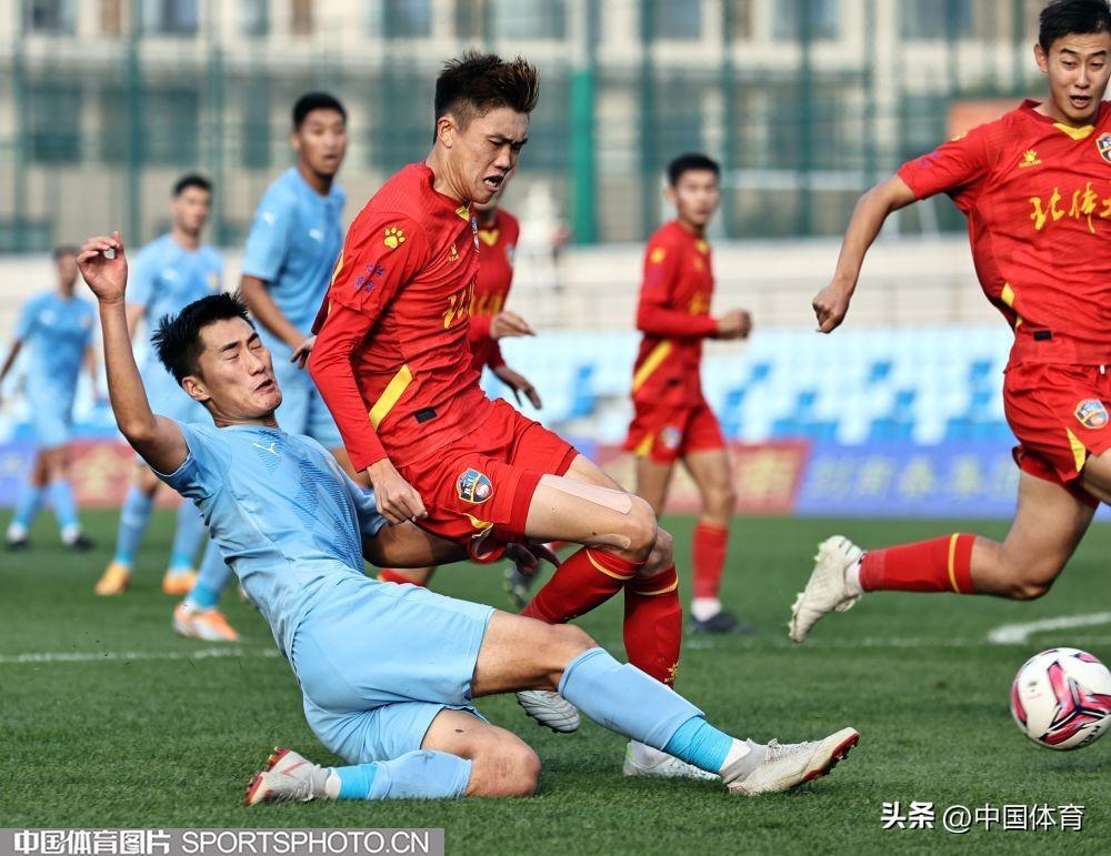 中國體育訊 10月26日,在2022年中國足球協會甲級聯賽第二十五輪(大連賽區)的一場比賽中,四川九牛隊(藍衣)以5比0大勝北京北體大隊(紅衣)。(中國體育圖片 王憲民 攝)
