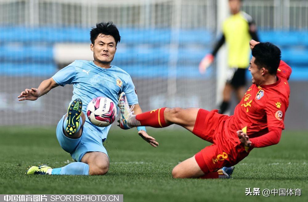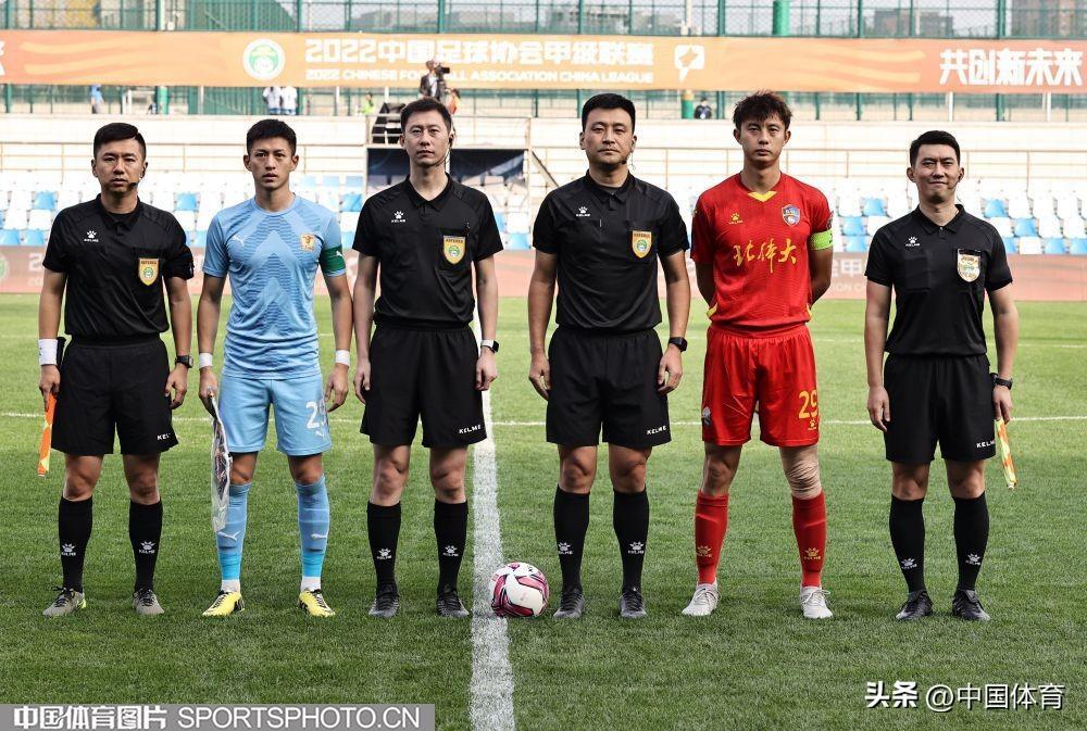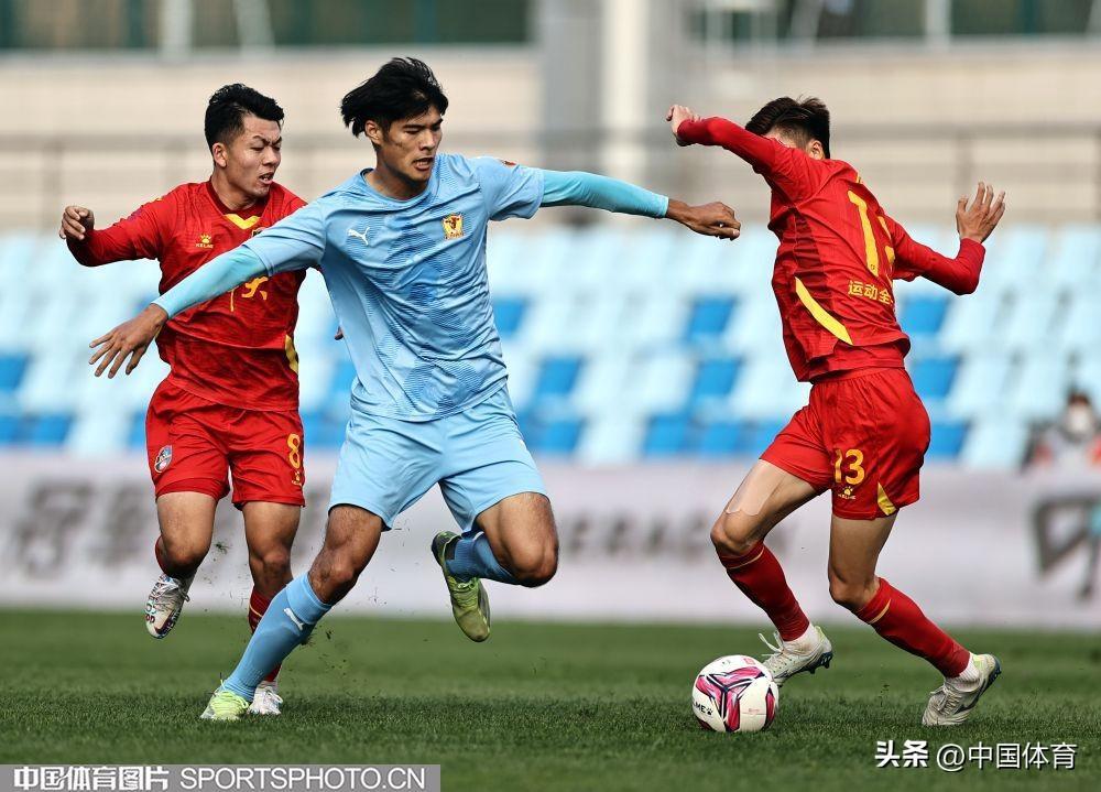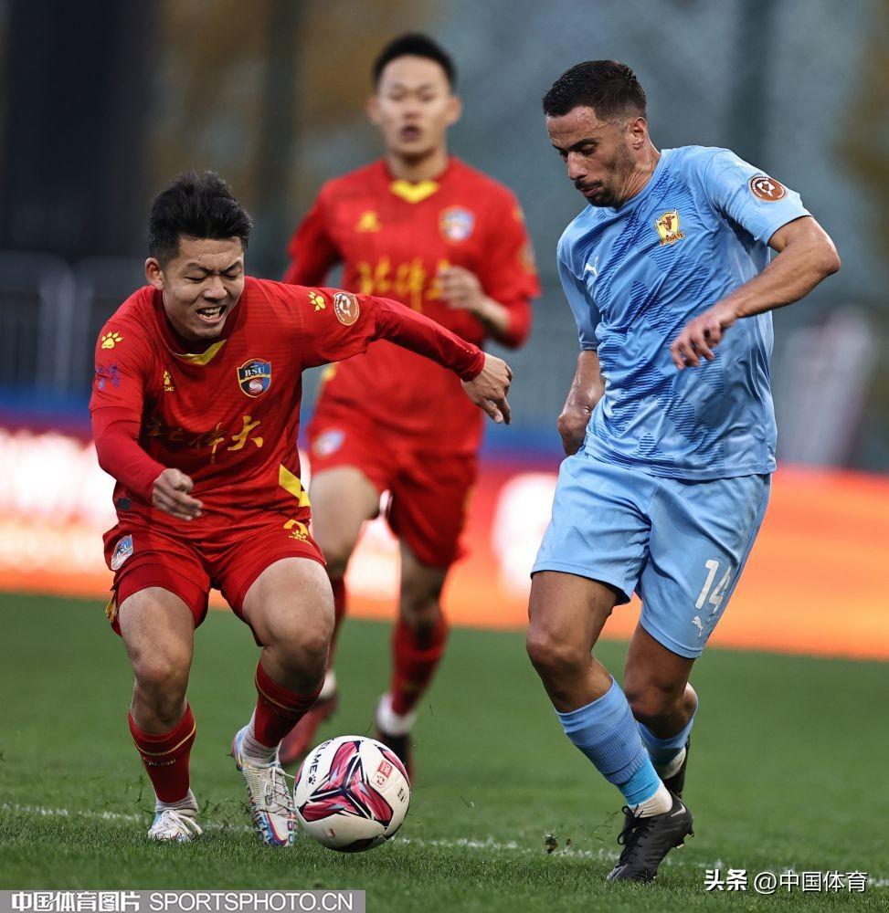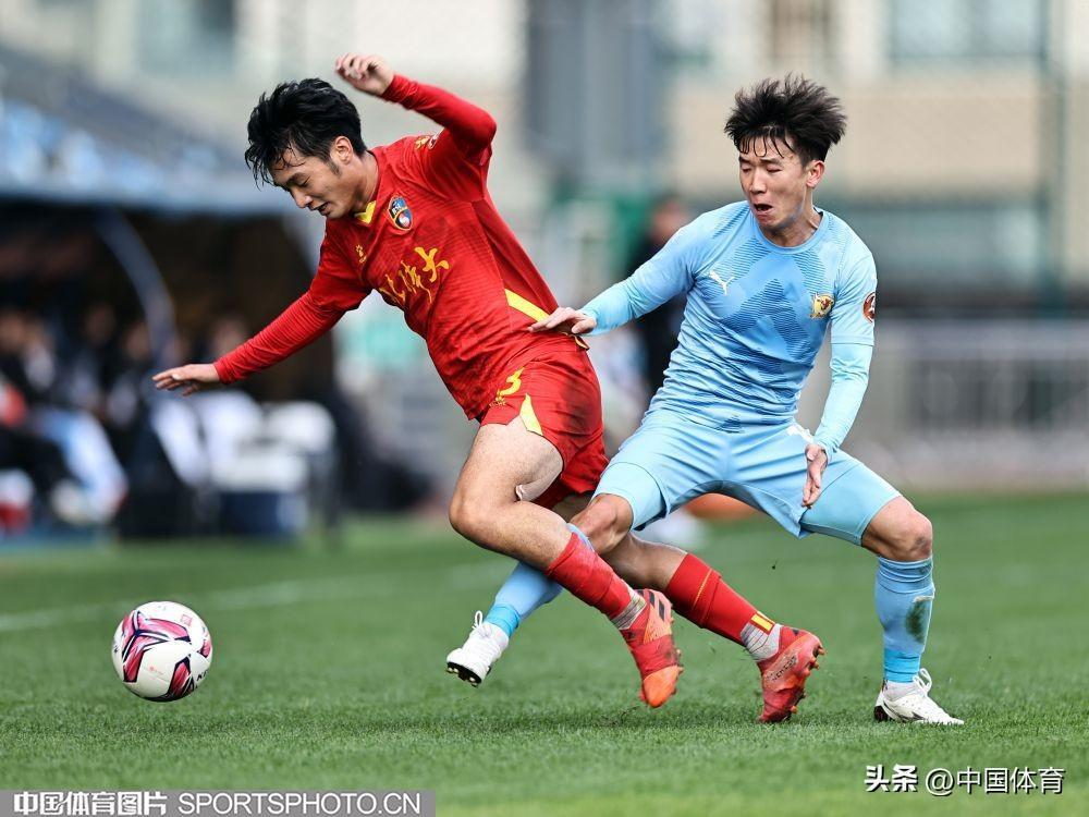 中國體育訊 10月26日,在2022年中國足球協會甲級聯賽第二十五輪(大連賽區)的一場比賽中,四川九牛隊(藍衣)以5比0大勝北京北體大隊(紅衣)。(中國體育圖片 王憲民 攝)