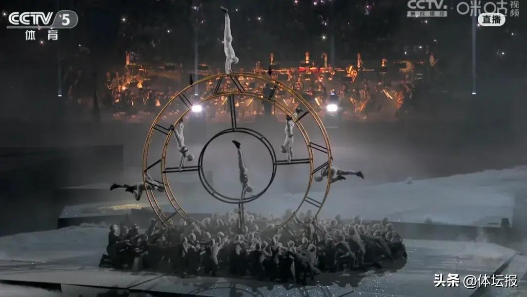 文藝表演《尋找奧林匹克》中登場的演員有馬戲團演員,跑酷運動員,還有來自於巴黎消防隊的體操隊隊員,這支體操隊成立於1919年(直播截圖)