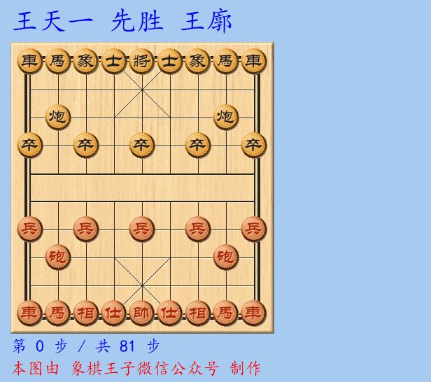 王天一執紅棋採取仙人指路陣,王廓應以對挺卒,佈局雙方互進左馬,紅方還回右中炮,轉以中炮橫車七路馬對屏風馬7卒右象。