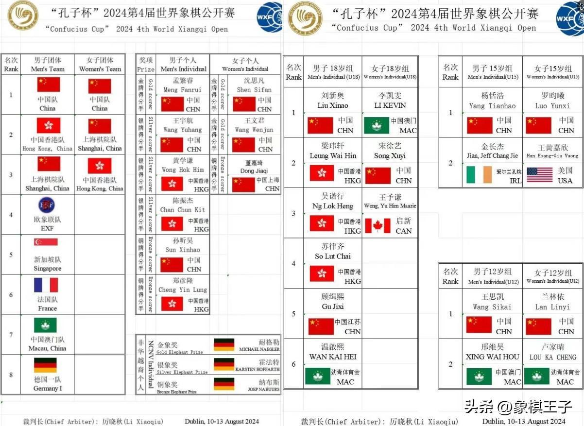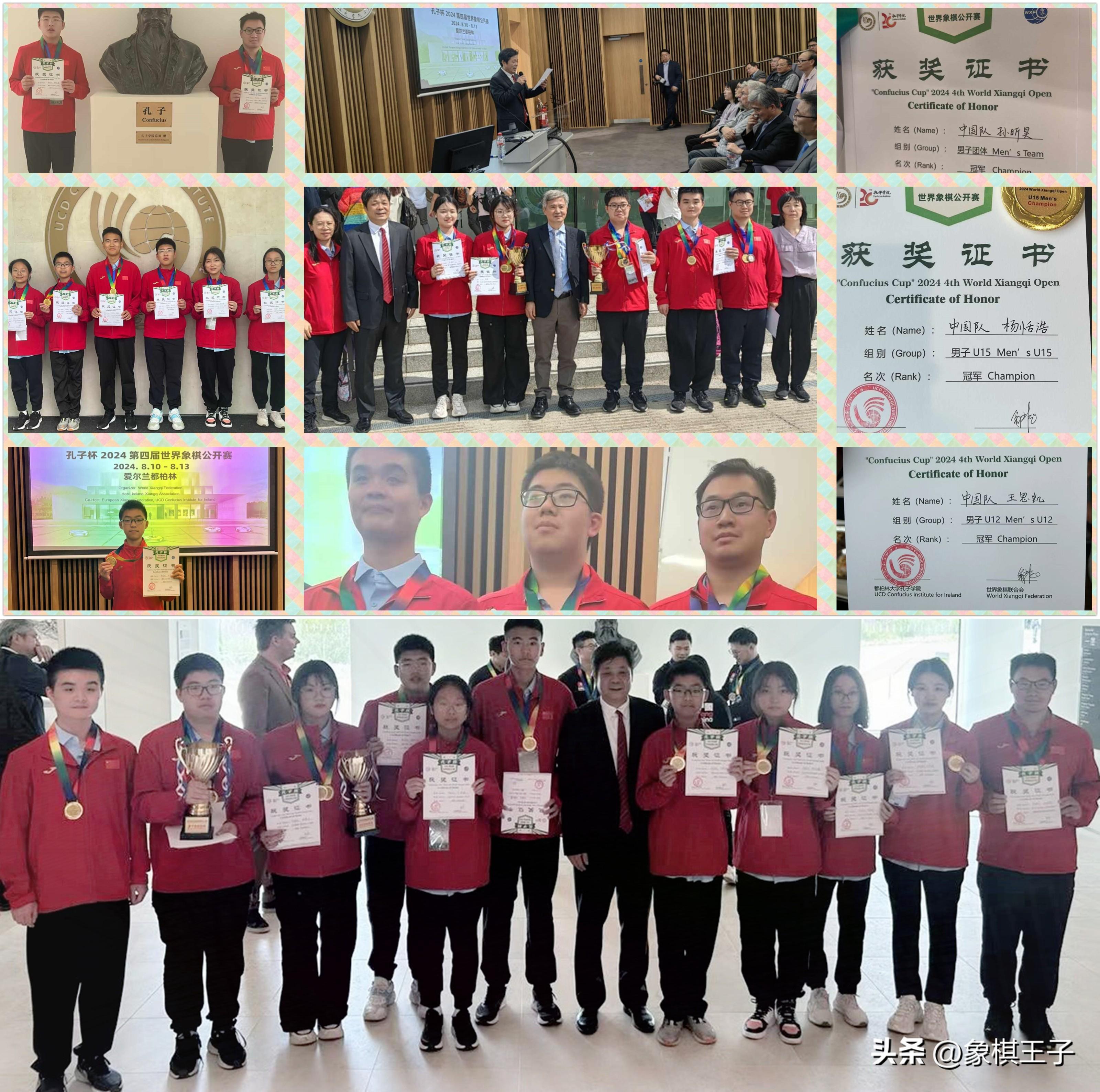 世界公開賽的大戰,在愛爾蘭都柏林大學孔子學院,火熱收兵,中國國家象棋隊發揮強勁,豪取男子團體、女子團體,U18男子,U15男子、女子,U12男子、女子,七塊金牌,震撼歐陸大地。