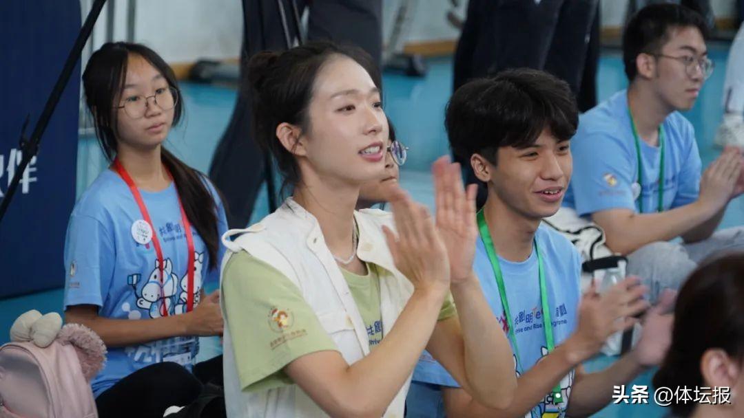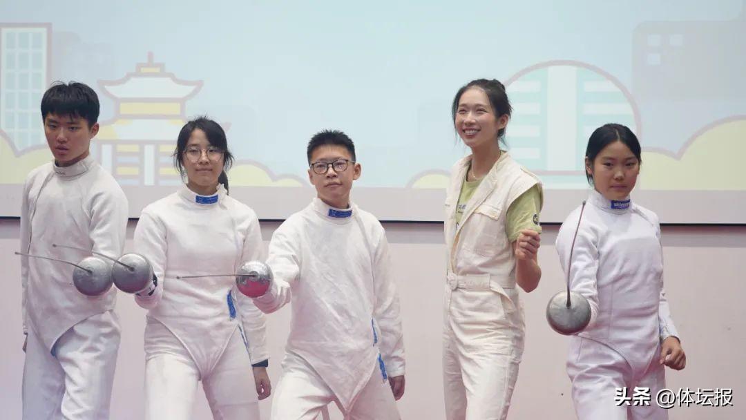 現場,江旻憓一身白色連體褲,梳着蓬鬆的丸子頭,臉上時刻洋溢着標誌性的笑容。她還和杭州市擊劍隊的四名隊員進行了交流,並對他們進行了現場指導。她說:“我奧運之後都沒見過小劍手,所以見到你們我很開心,也提醒了我當時爲什麼那麼喜歡擊劍。”
