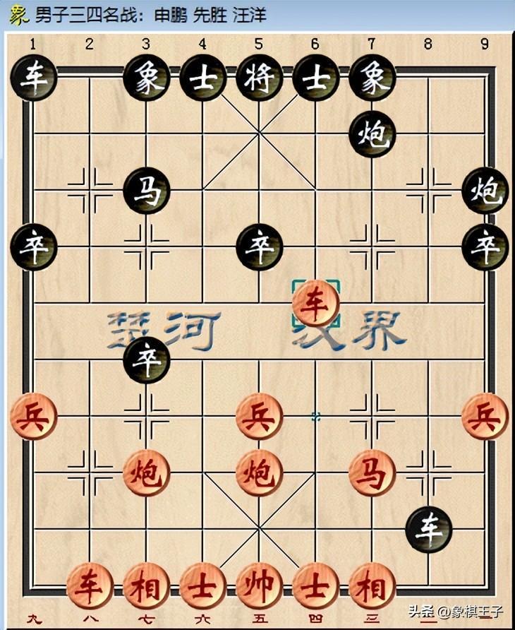 汪洋也不含糊,黑方衝卒制馬,左路平炮兌車,復高車保馬,退下2路炮,遊動左側,驅打紅棋右車。
