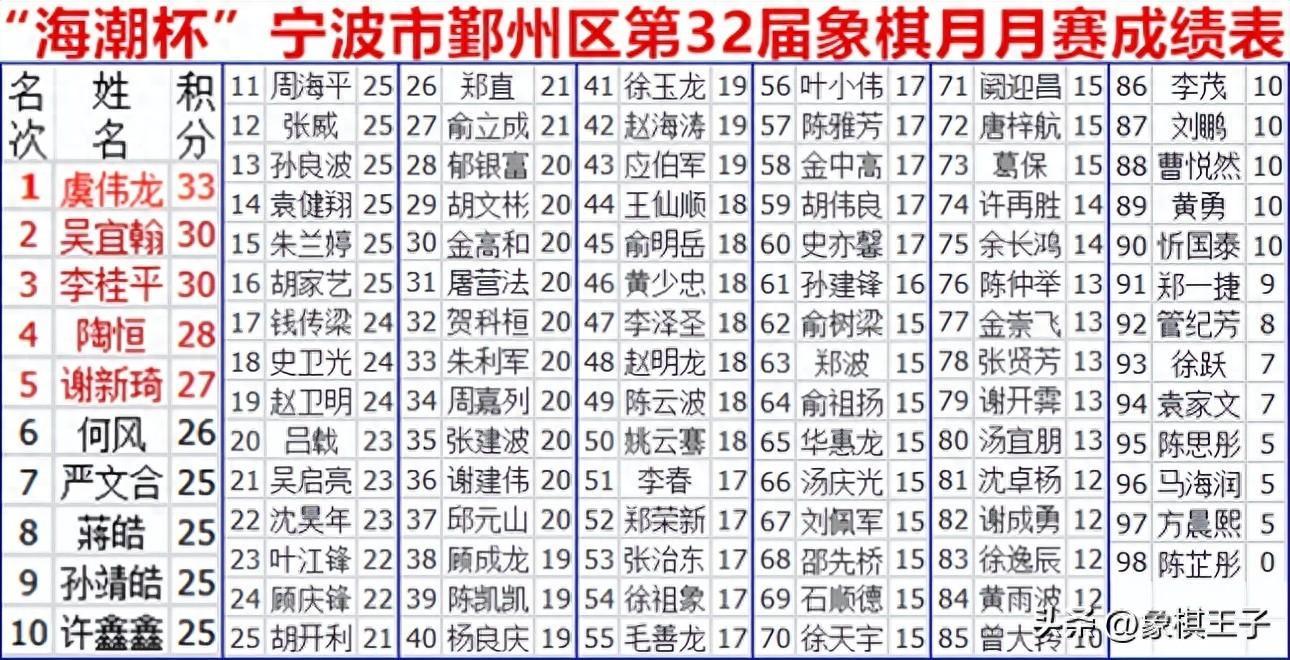 此次第三十二屆海潮杯,共有來自全國各地及寧波本土,餘姚、杭州、溫州、台州、麗水、紹興等的九十八位強將,展開七輪積分強勢搏鬥。