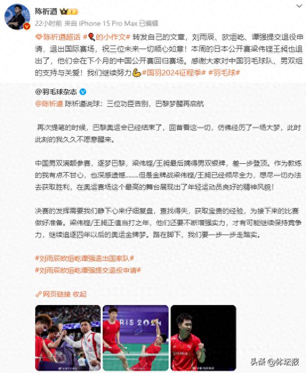 8月19日,中國羽毛球隊男雙教練陳祈遒通過社交媒體發文確認,劉雨辰、歐烜屹、譚強三位雙打組成員提交退役申請,將退出國際賽場。