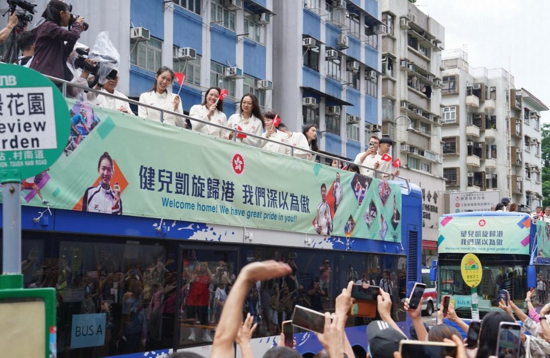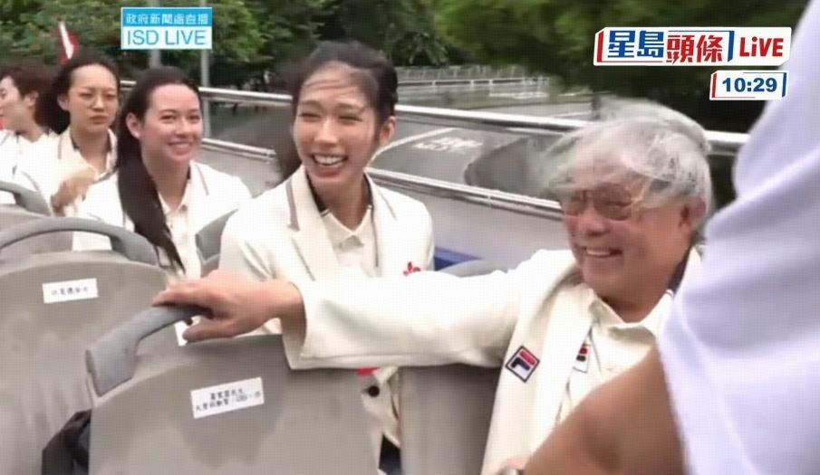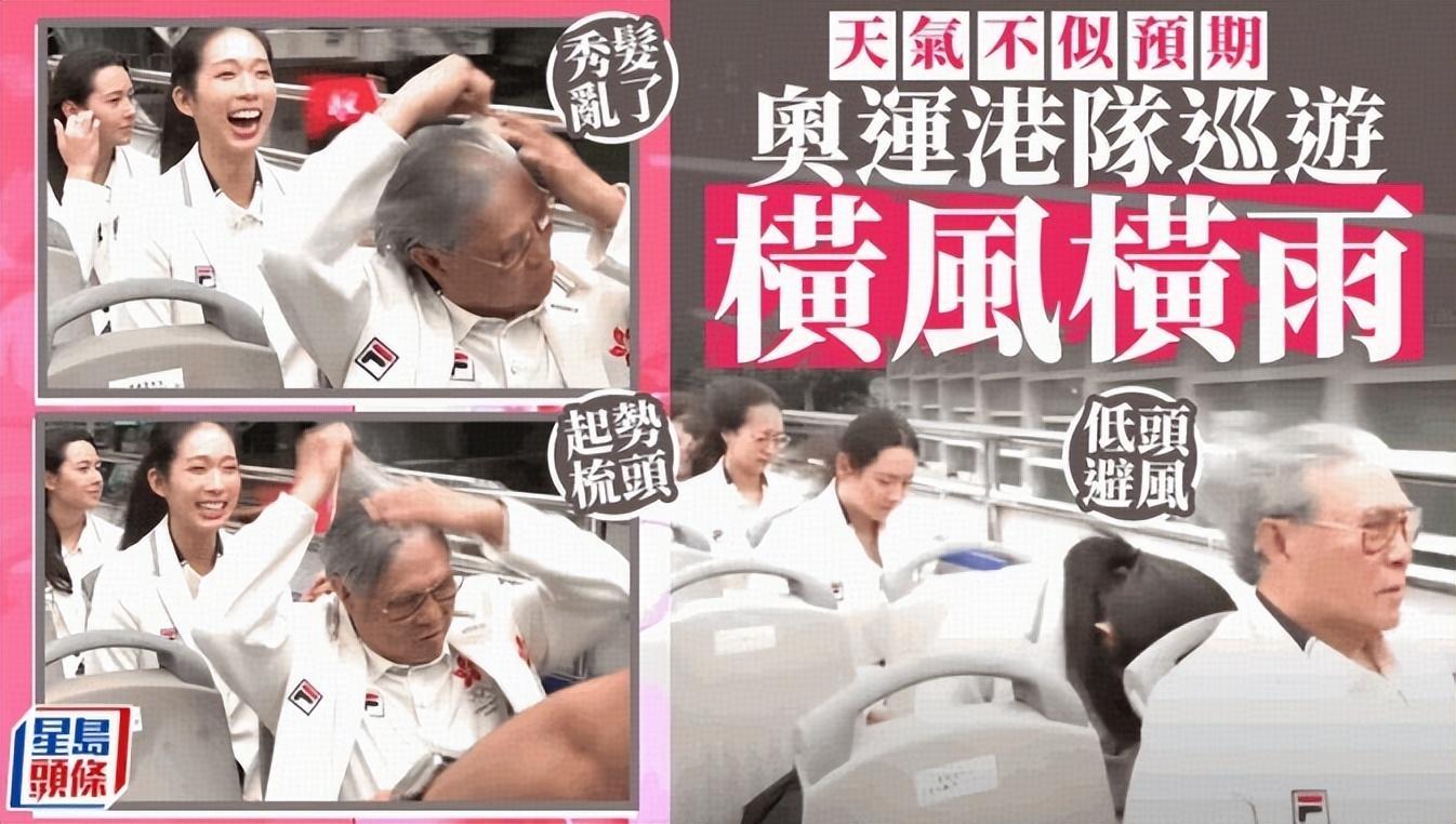 近日,中國香港隊在巴黎奧運取得佳績之後,也開始了慶祝活動,他們乘坐敞篷巴士巡遊並與巿民同慶,雖然香港當日的天氣狀況不佳,吹着大風,淅瀝瀝地下着雨,仍無阻市民冒雨一睹港將風采,不過,坐在敞篷巴士裏的奧運健兒,以及78歲高齡的霍震霆,簡直被大風吹得東倒西歪,頗爲狼狽!