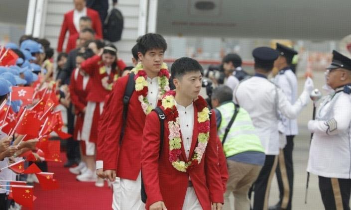經過幾個小時的飛行之後,這架“含金量”十足的飛機正式落地香港國際機場,特區政府在停機坪舉行歡迎儀式,爲運動員們戴上大花環,現場氛圍熱烈,接機的香港市民自豪感滿滿,衆多市民激動地揮舞着旗幟。