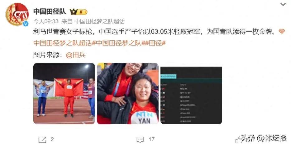 北京時間8月31日,利馬U20田徑世青賽賽場上傳來好消息。在女子標槍決賽比拼中,來自浙江的嚴子怡以63米05的成績爲中國隊贏得一枚寶貴的金牌,年僅16歲的她第三次站上世界級賽事的最高領獎臺。