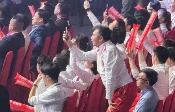覃海洋甚至唱着唱着拿出手機錄上了,有一種又燃又混亂的感覺,彼時,臺下乒乓球隊員們再一次笑到“缺氧”,果然是最佳氣氛組。