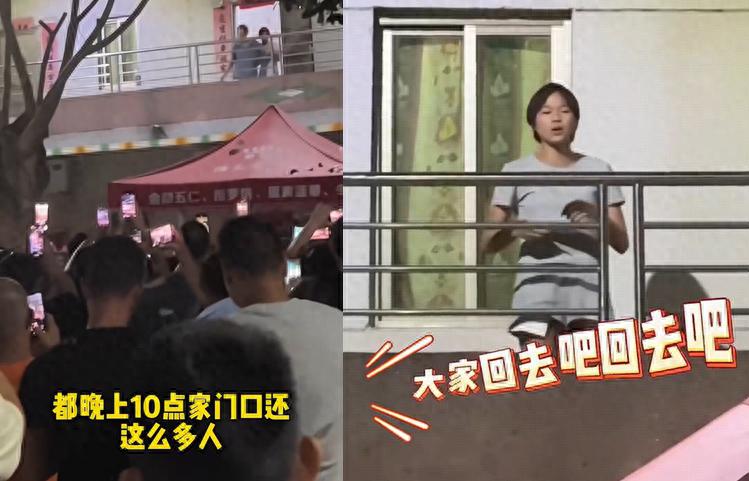 在全紅嬋老宅院子前,有大批粉絲逗留,還有人開手機直播,白天也就算了,到了晚上,全紅嬋和家人們要休息了,依然門口圍了很多人,無奈之下,全紅嬋走到二樓陽臺的地方,向門外的粉絲路人喊話,希望他們早點回家,不要聚集了,因爲外面的聲音太吵,還影響到了爺爺奶奶休息,全紅嬋說:“大家小聲一點,回去吧,我們要休息了!”