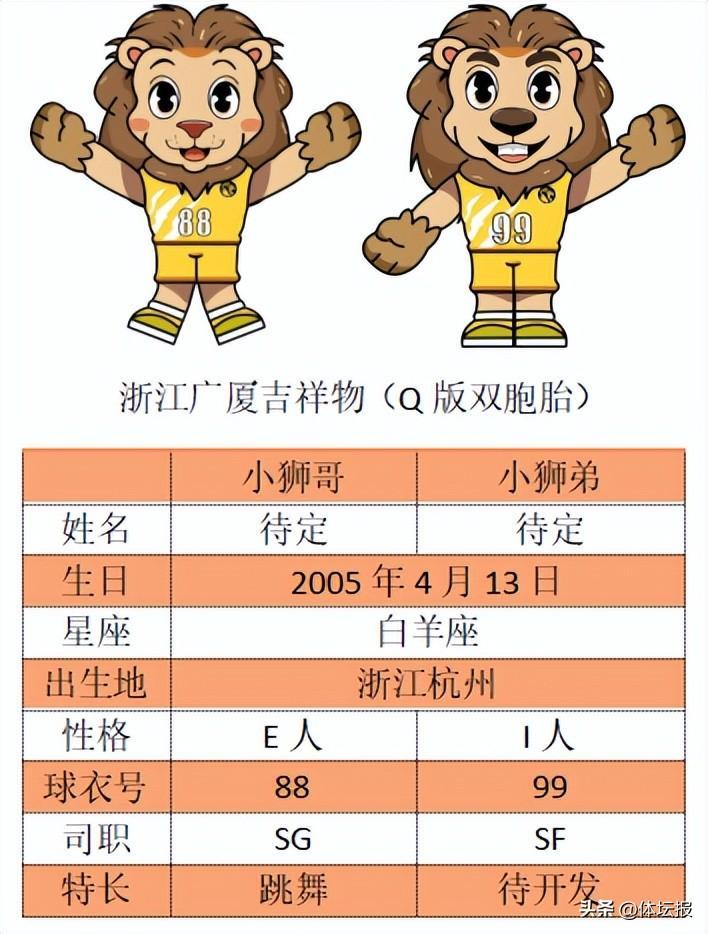 浙江廣廈的雙胞胎獅子,是CBA球隊首次推出雙胞胎吉祥物。“小獅哥”和“小獅弟”分別身披88號和99號球衣,“哥哥”爲E人(外向),擅長跳舞,司職得分後衛;“弟弟”爲I人(內向),司職小前鋒。
