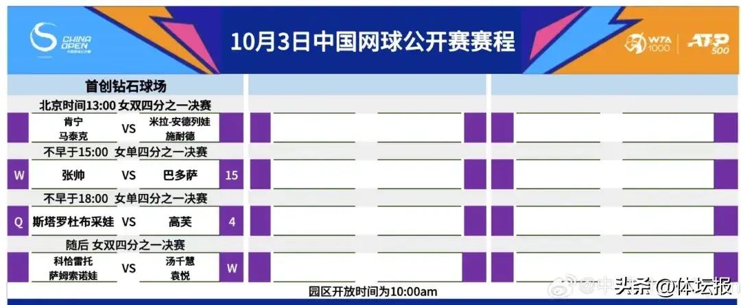 隨後,中國組合湯千慧/袁悅也將登場,她們的對手將是科恰雷託/薩姆索諾娃,兩對組合將在首創鑽石球場的最後一場爭奪一個女雙四強席位。