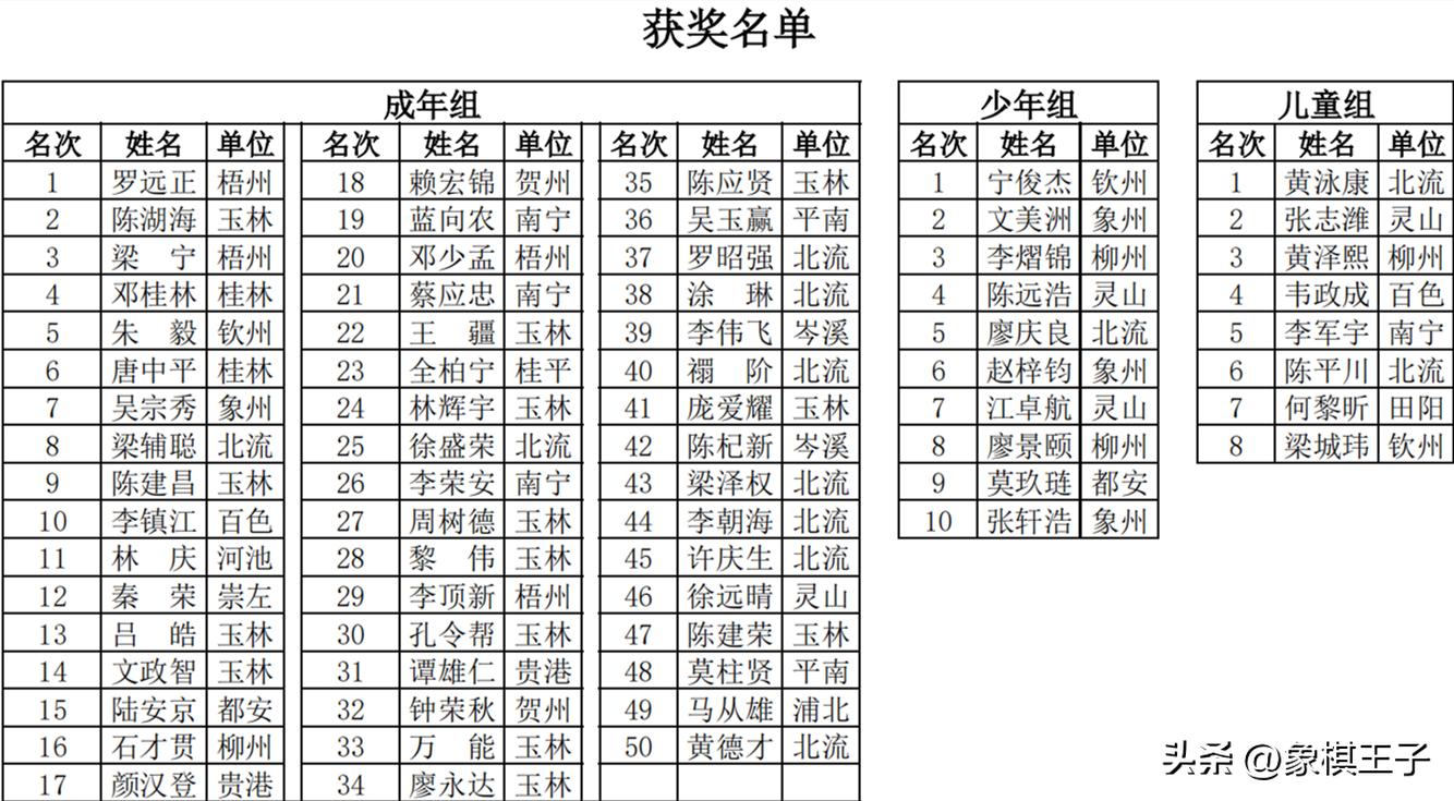 賽會各組二百多將火力廝殺,11輪積分下來,排定座次,比賽節日期間,從成人到玉林、北流,幸運、道德,少年、兒童,全部有獎,前五十名皆厚獎。