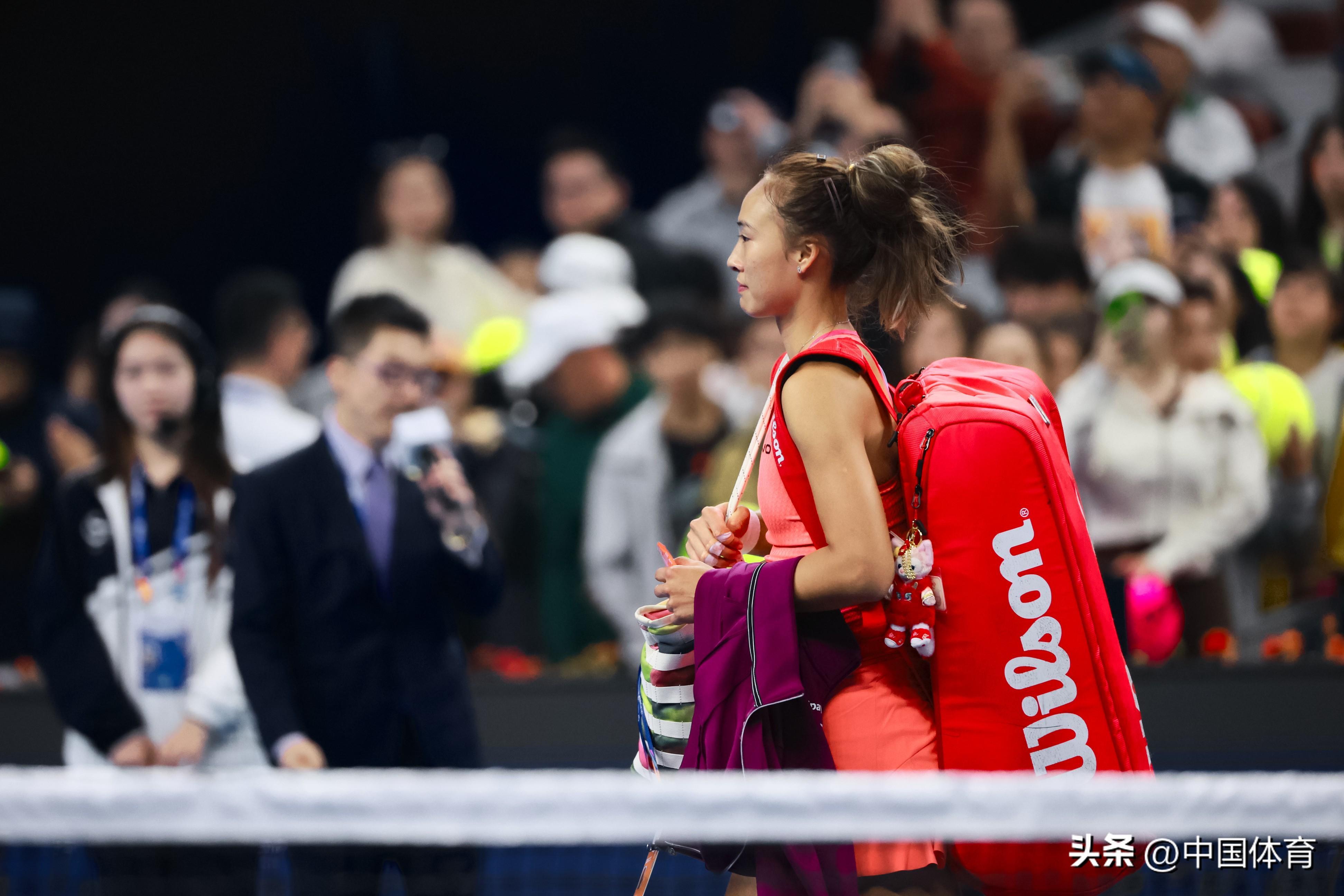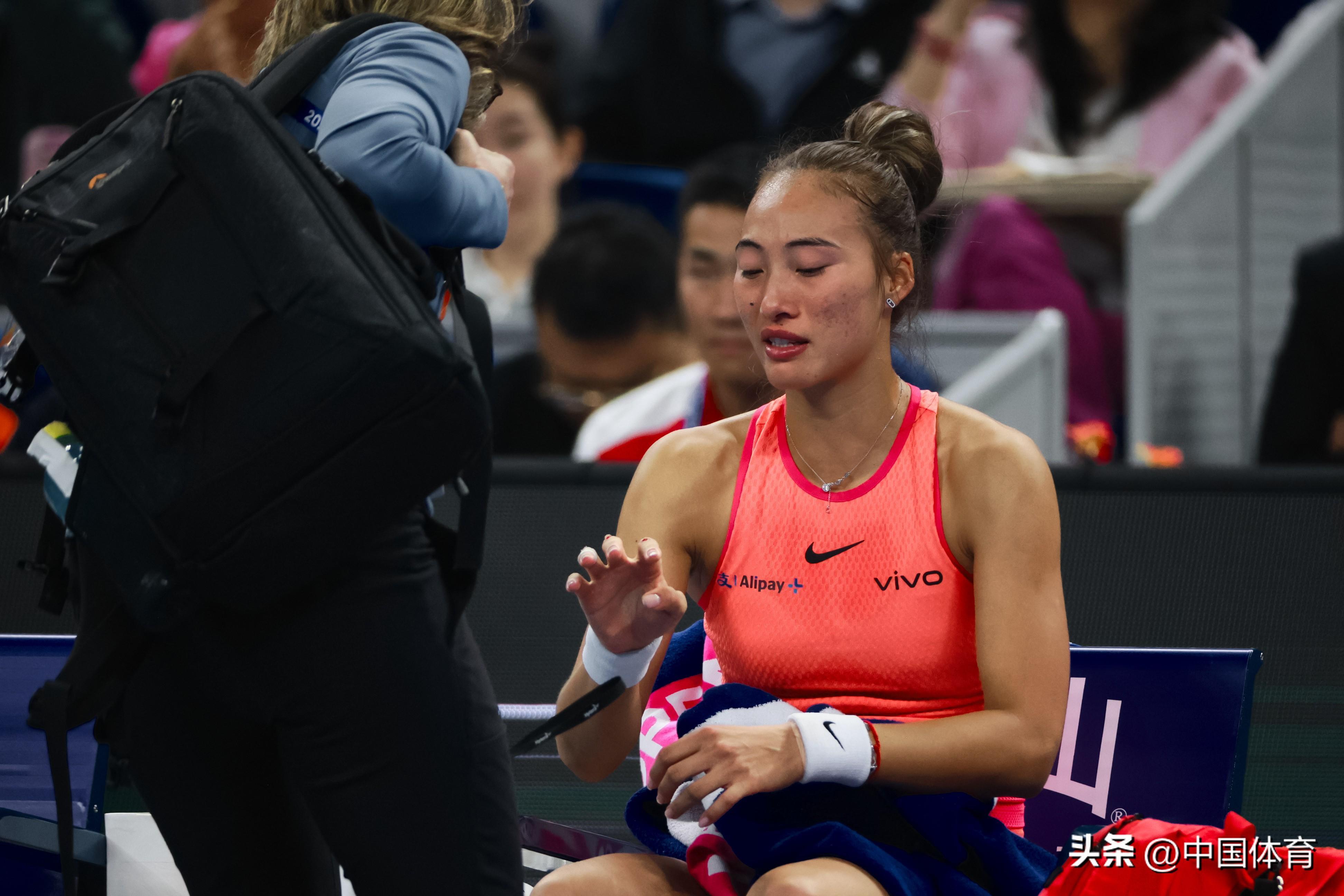 中國體育訊 10月5日晚,中國網球公開賽資格賽在國家網球中心繼續進行。女單半決賽中,5號種子、中國選手鄭欽文在比賽中因救球不慎摔倒,導致手指受傷,最終大比分0比2(3比6、4比6)負於捷克選手穆霍娃,無緣決賽。(中國體育圖片 鹿麟 攝)