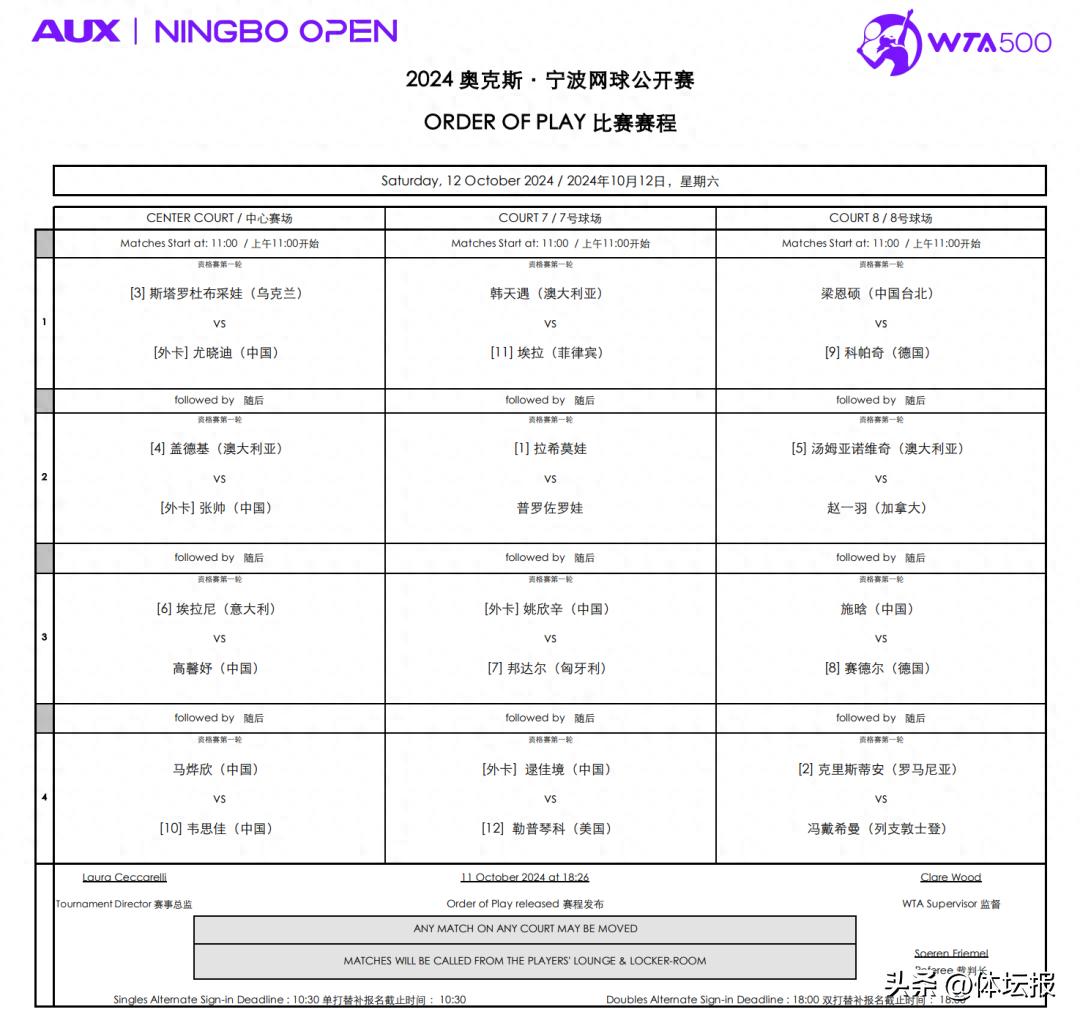 10月12日,寧波網球公開賽單打資格賽開打。根據此前公佈的籤表,兩屆大滿貫女雙冠軍張帥領銜多位中國金花參賽,前法網女單亞軍、女雙金滿貫得主埃拉尼,以及湯姆亞諾維奇、斯塔羅杜布採娃等名將也將出戰。