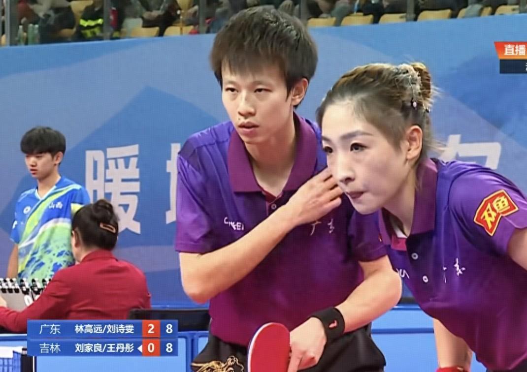 結果兩人搭檔的第一場,就取得了3比0的橫掃勝利,算是開了一個好頭,此役,代表廣東隊參賽的林高遠和劉詩雯,挑戰來自吉林隊的劉家良和王丹彤,第一局,11比5,林高遠與劉詩雯輕鬆拿下,到了第二局,他們狀態依舊火熱,兵不血刃,11比6再勝一局。