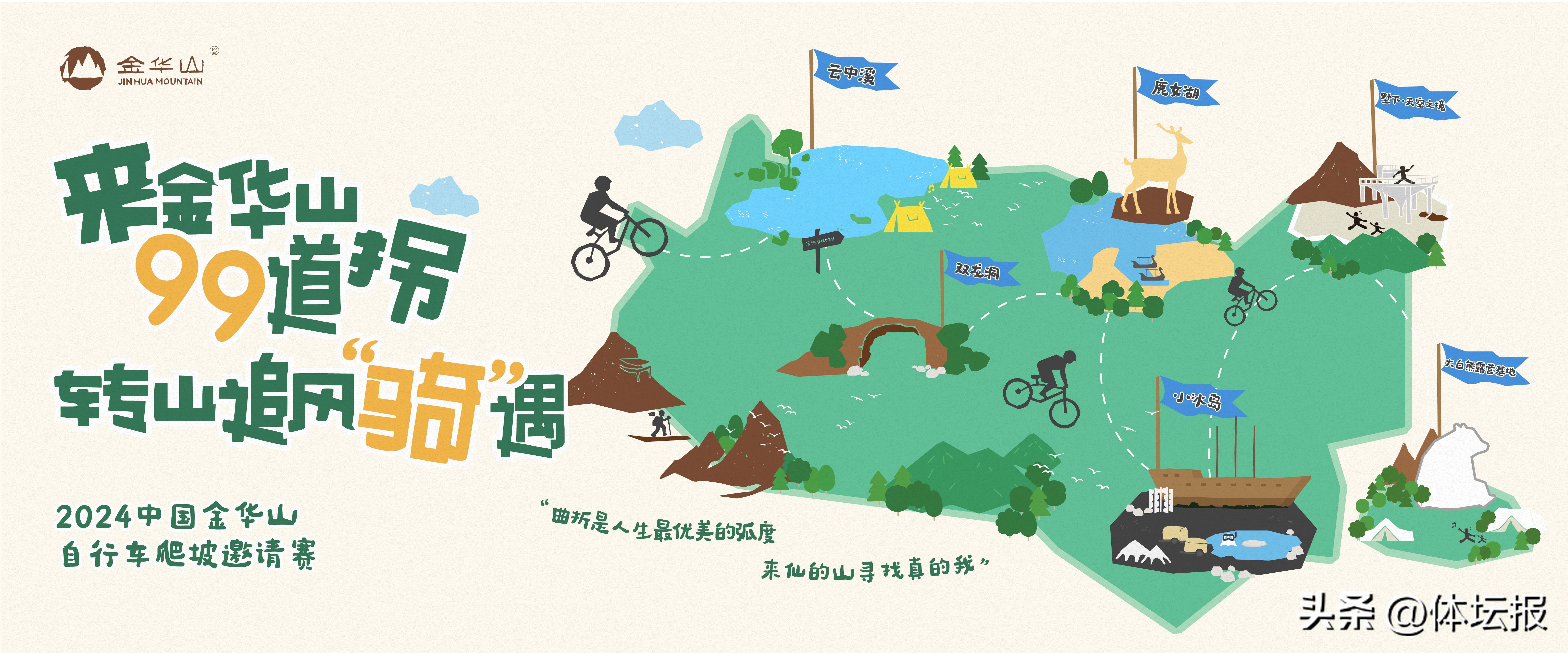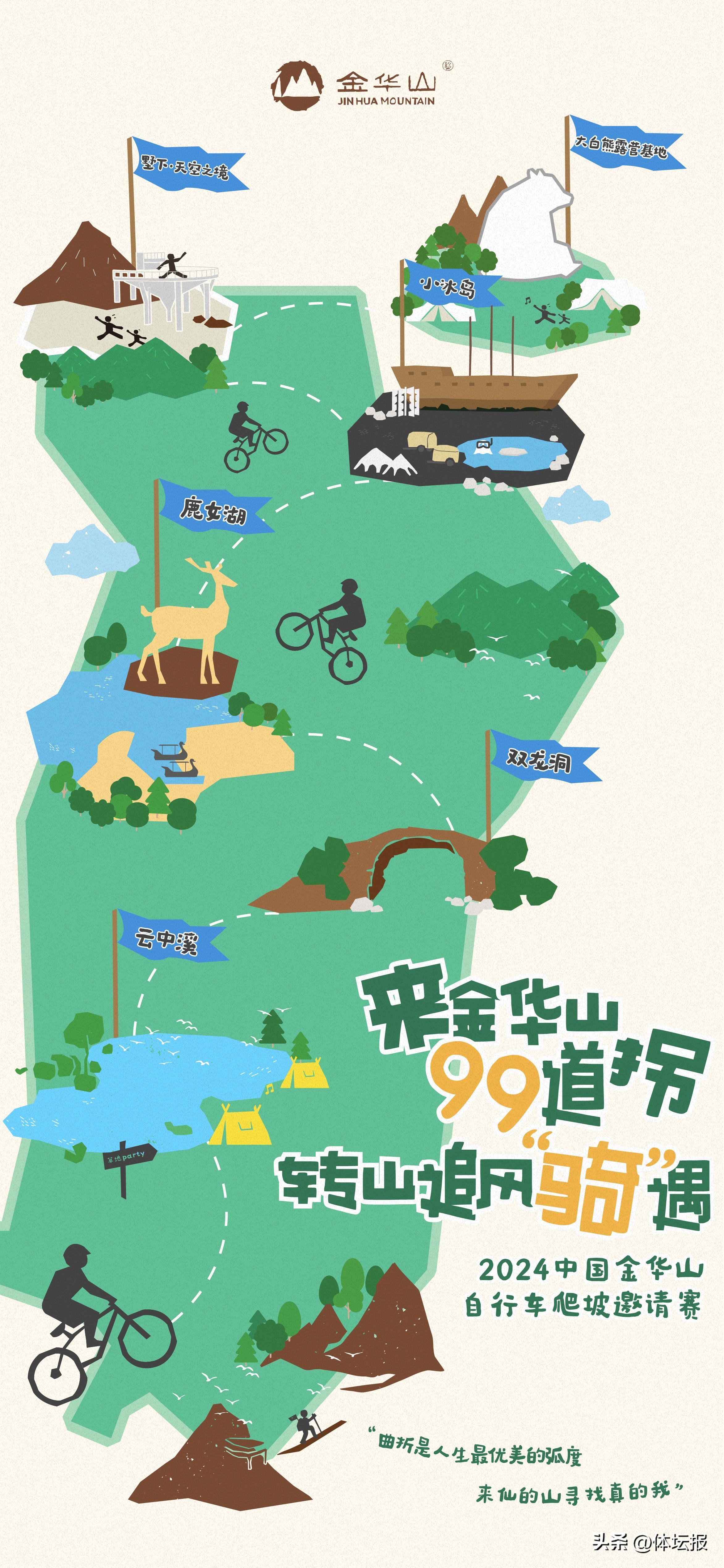 本次賽道將智者寺、毛澤東主席視察雙龍電站舊址、雙龍洞、鹿女湖、墅下·天空之鏡等自然景點、人文景觀串聯成線,經過以陡急爬坡、S彎、U型彎等爲主的99個彎道,最終到達大白熊森林露營基地。這條金華山特色賽道IP將通過賽事推廣至全國,打造中國“建議騎行打卡地”。