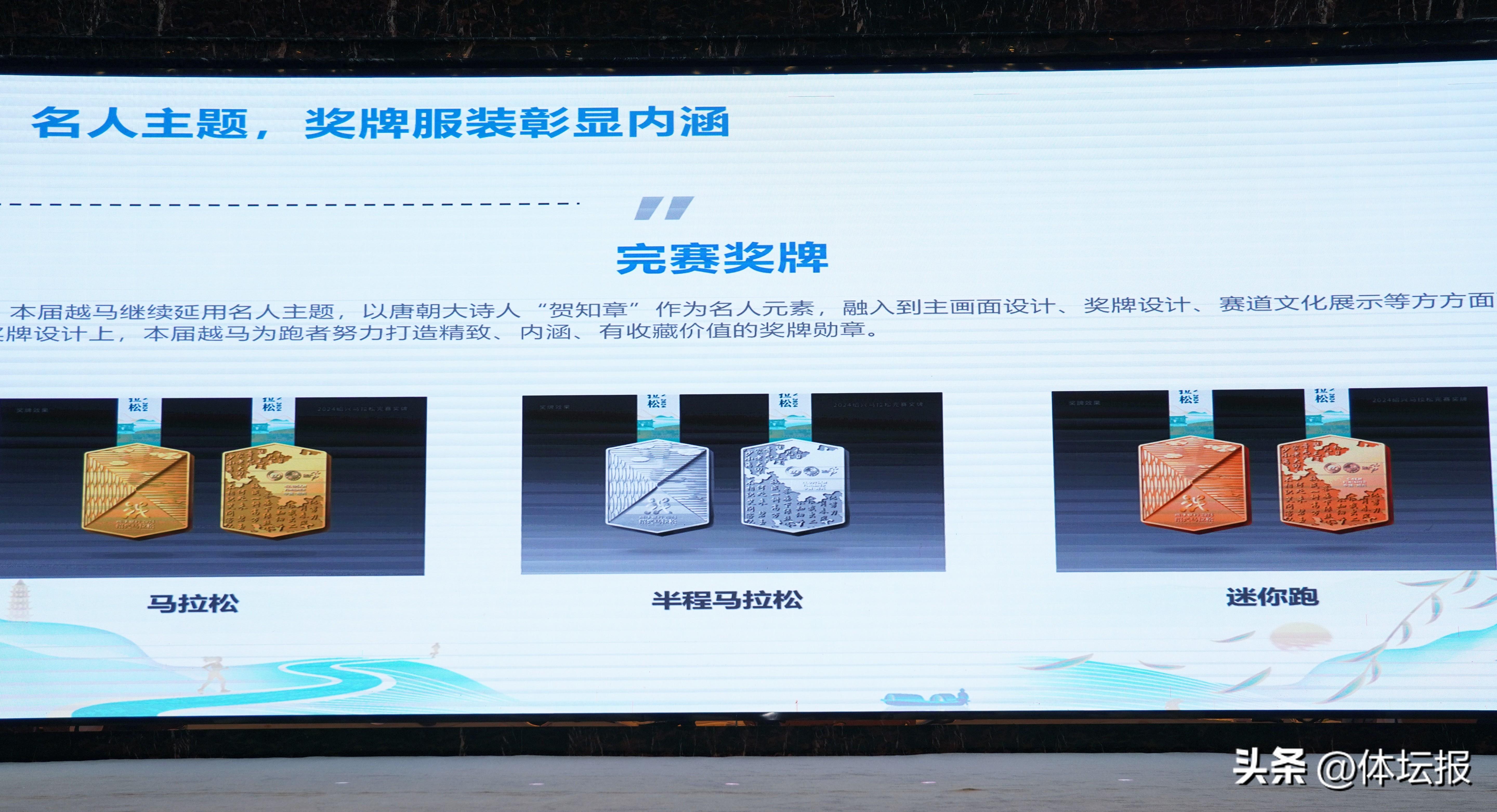 本屆越馬繼續延用名人主題,以唐朝大詩人“賀知章”作爲名人元素,融入到主畫面設計、獎牌設計、賽道文化展示等方方面面。今年越馬借賀知章名句“少小離家老大回”,專門組織高層次人才、金融、科技、醫療領域的專家及企業家“回鄉跑團”。在獎牌設計上,以典故“金龜換酒”的金龜作爲整體造型,並融入紹興鑑湖的局部造型,結合賀知章的名篇佳句,既有紹興的自然風光,也能體現賀知章在詩詞文學上的過人才情。參賽服在設計上,以鑑湖水波造型爲底,全身採用漸變色調,背後印有“越馬”及“文化越馬”印章,進一步突出紹興馬拉松的文化內涵。2024越馬繼續推出線上賽,邀請全世界跑友在高德地圖上點亮奔跑足跡,同時還將舉辦2024趣味訓練營暨直江公園漫步行、賽後美食區等配套活動,爲越馬營造良好氛圍。